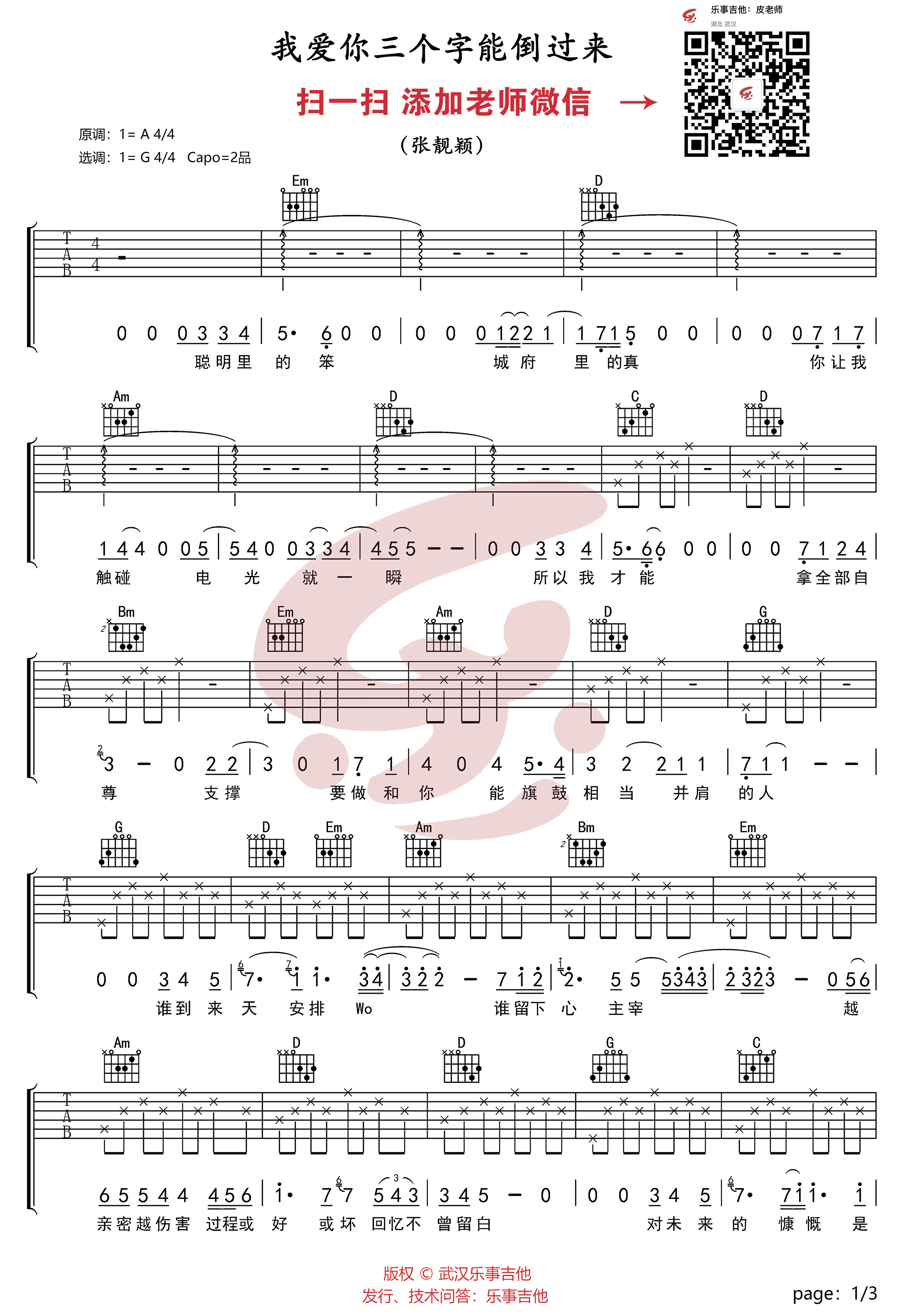 曲谱介绍: 我爱你三个字能倒过来吉他谱,张靓颖献唱《电视剧《幕后之王》主题曲,原调A调,选调G,变调夹夹第二品。乐事吉他编配出品,91吉他谱网站上传。 温柔也最具力量的声音,唱出情感世界里的成长与思考,当爱情里的仰望变成旗鼓相当,两人的故事,一人的剧情。那个孤独的你,是否期望过“我爱你这三个字能倒过来”呢?