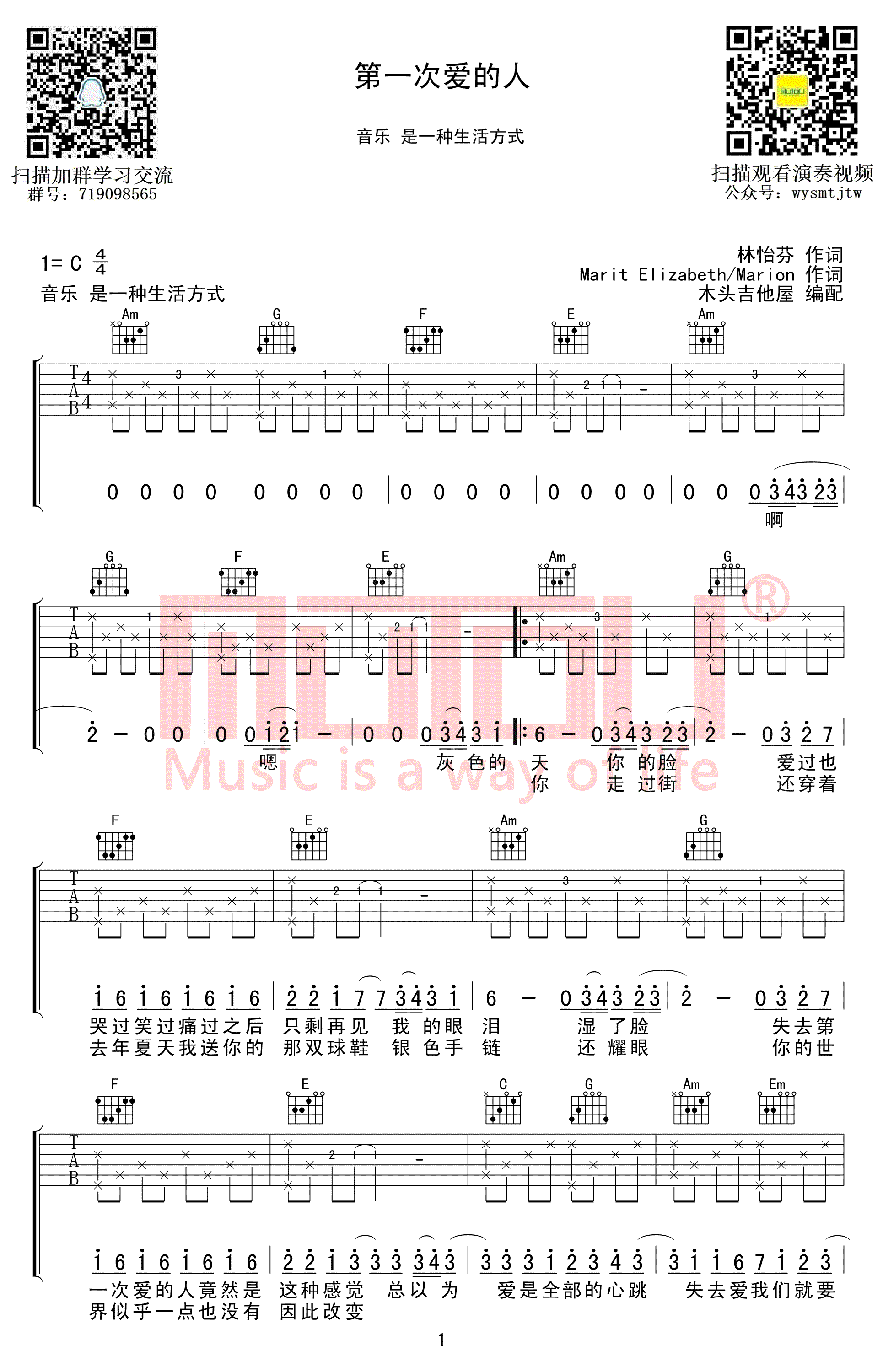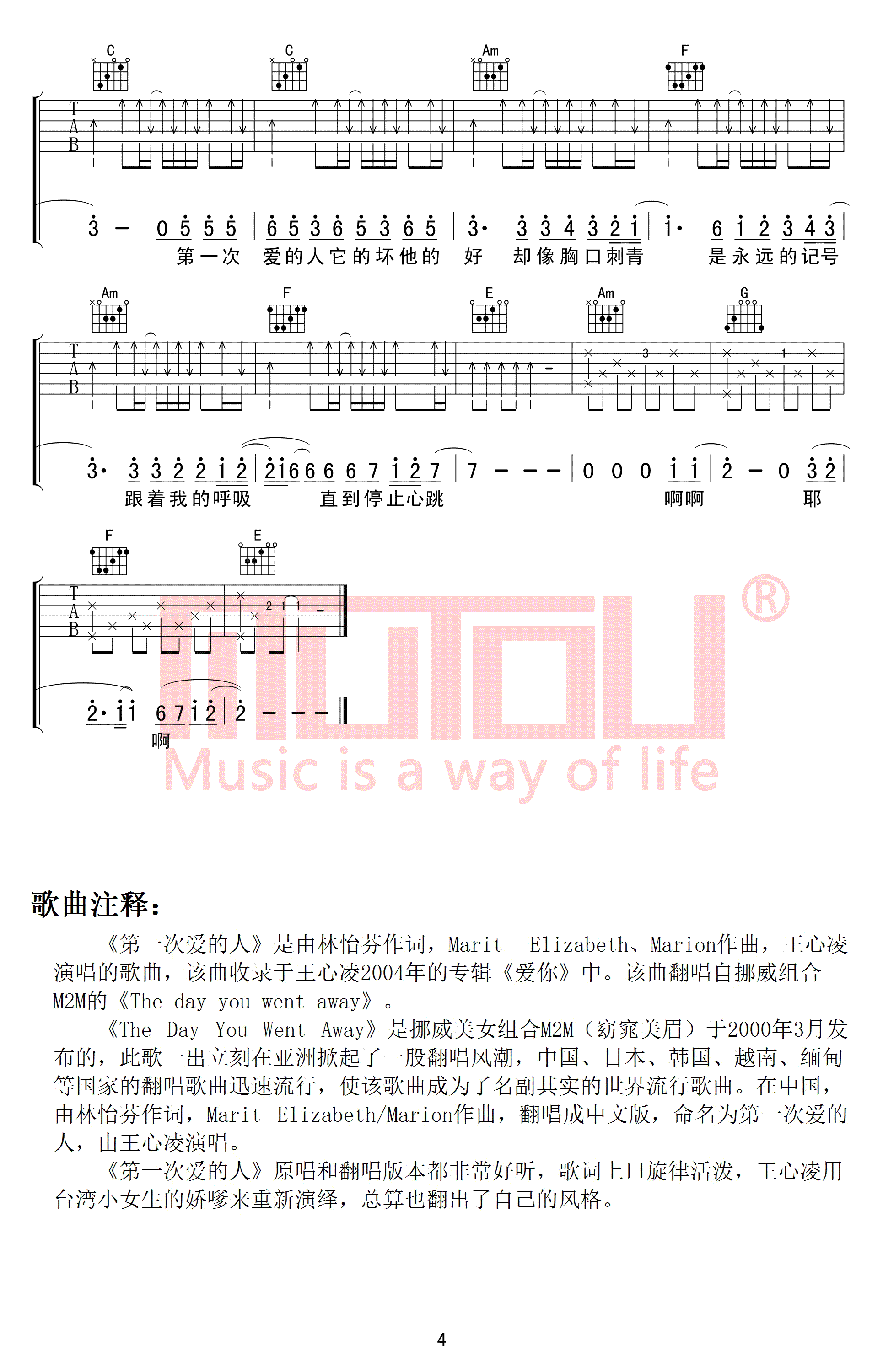 曲谱介绍: 第一次爱的人吉他谱,王心凌演唱的一首经典老歌,翻唱自挪威组合M2M窈窕美眉演唱的英文原版歌曲《The Day You Went Away 》,第一次爱的人六线谱,C调弹唱图片高清版,共四张谱例。感谢木头吉他屋出品,91吉他谱上传。 琅琅上口的歌词轻快活泼的旋律,前奏一响,满是初恋的回忆,走过青涩年华你是否记得第一次爱的人?