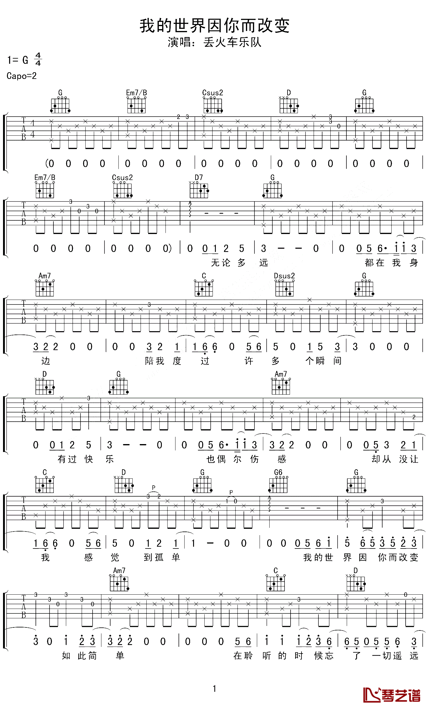 我的世界因你而改变吉他谱 - 丢火车乐队 - 吉他弹唱谱
