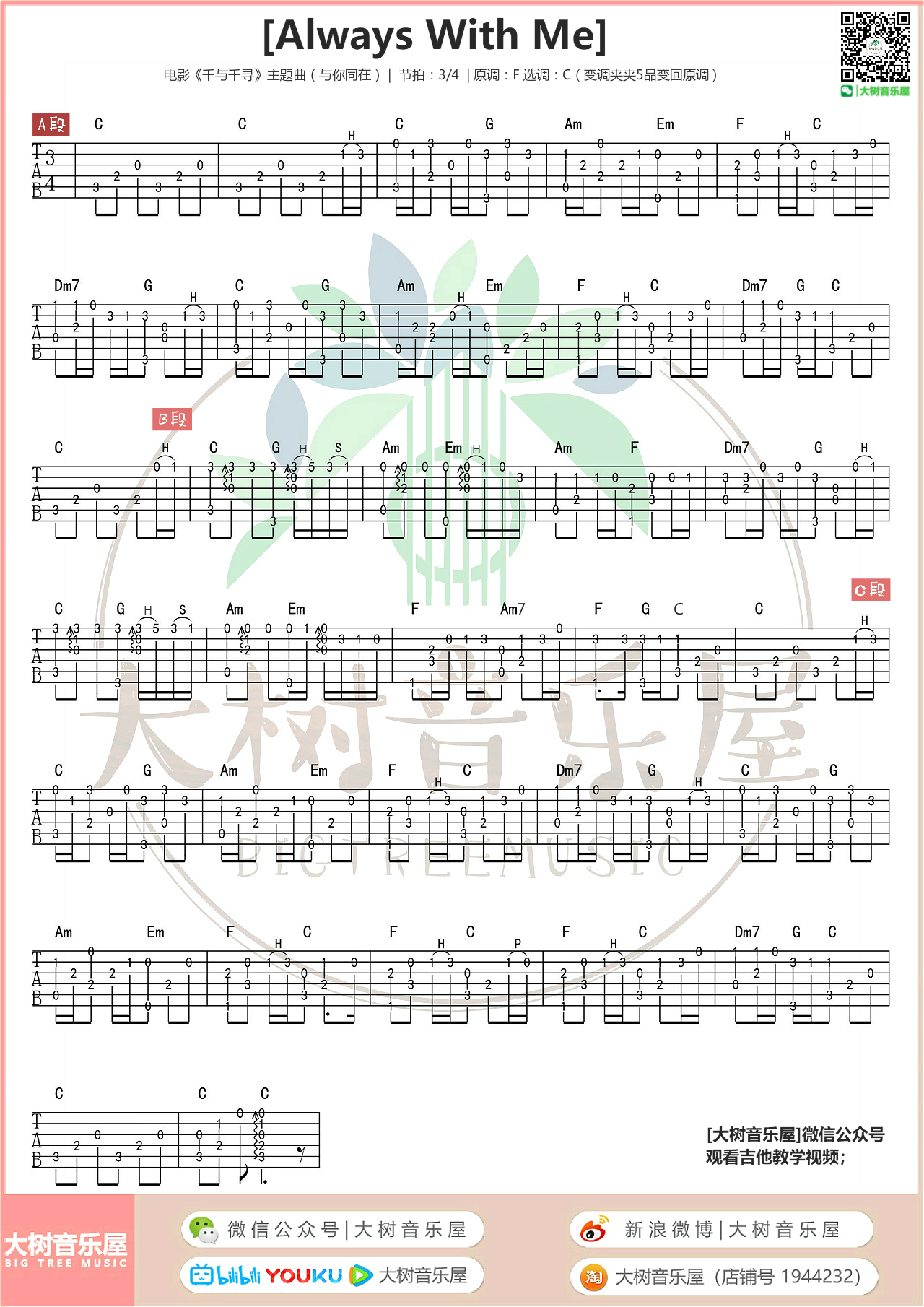 Always with me吉他谱 - 动漫千与千寻主题曲 - 吉他独奏谱