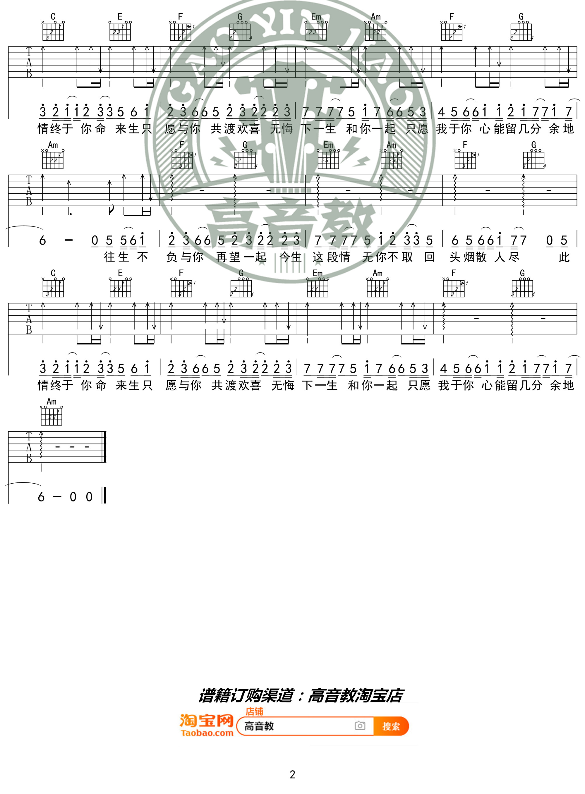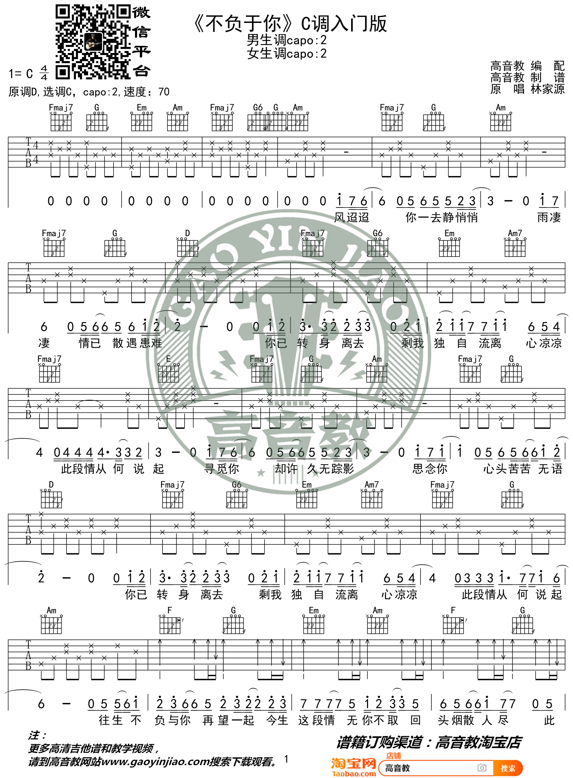 曲谱介绍: 抖音热歌《不负于你》吉他谱分享,来自高音教编配C调入门版六线谱,速度每分钟70拍,弹唱变调夹夹第二品,原调D调。