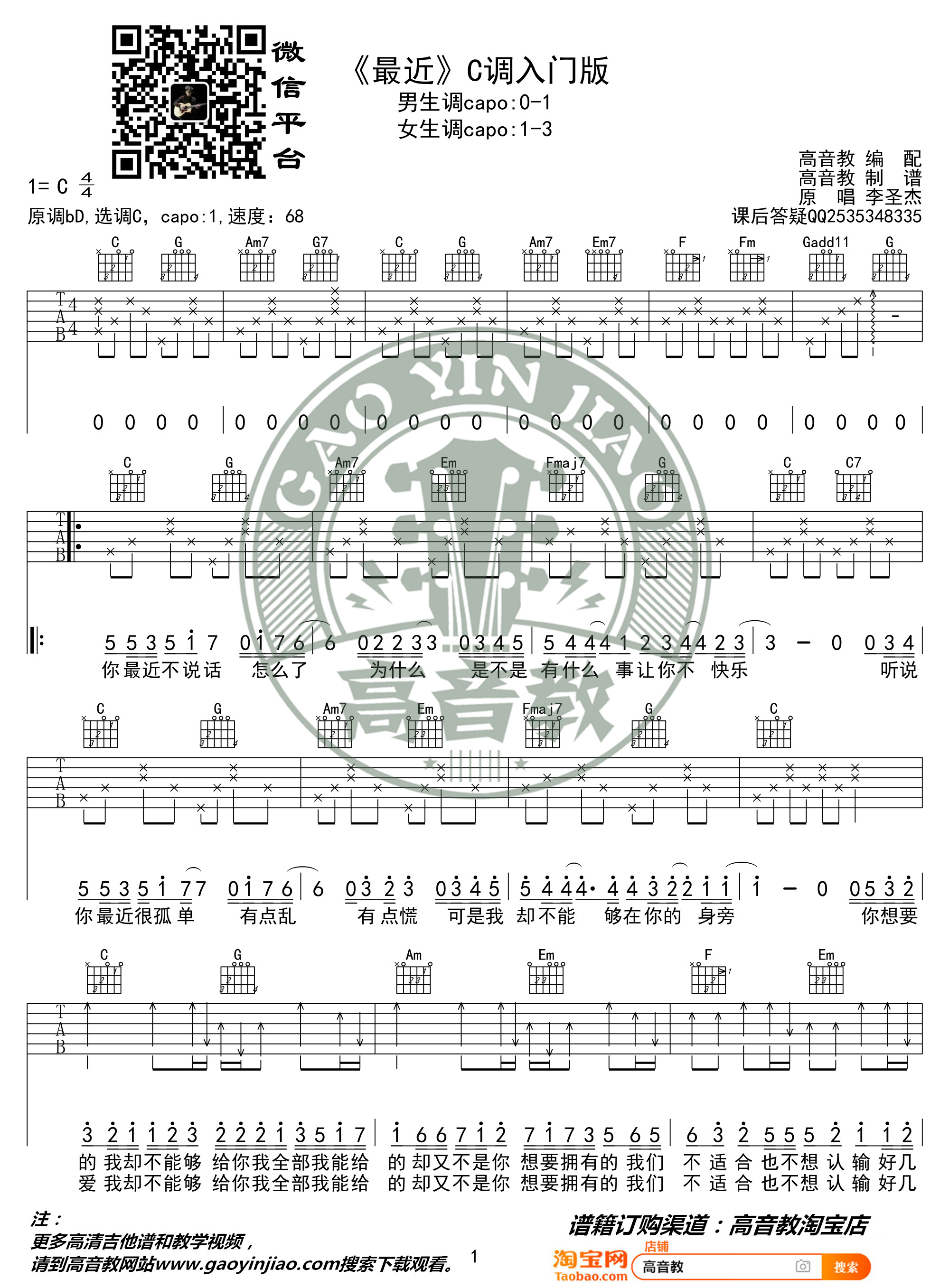 最近吉他谱 - 李圣杰 - C调吉他独奏谱