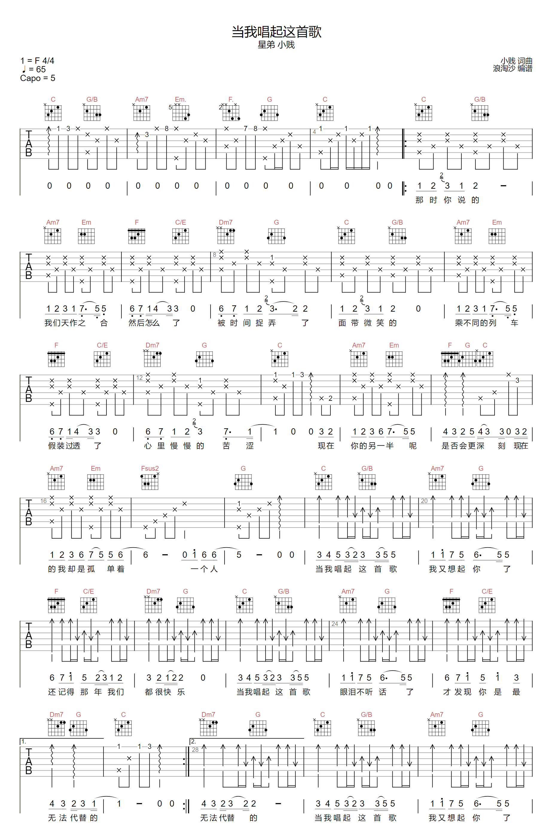 当我唱起这首歌吉他谱 - 小贱/星弟 - C调吉他弹唱谱 - 原版