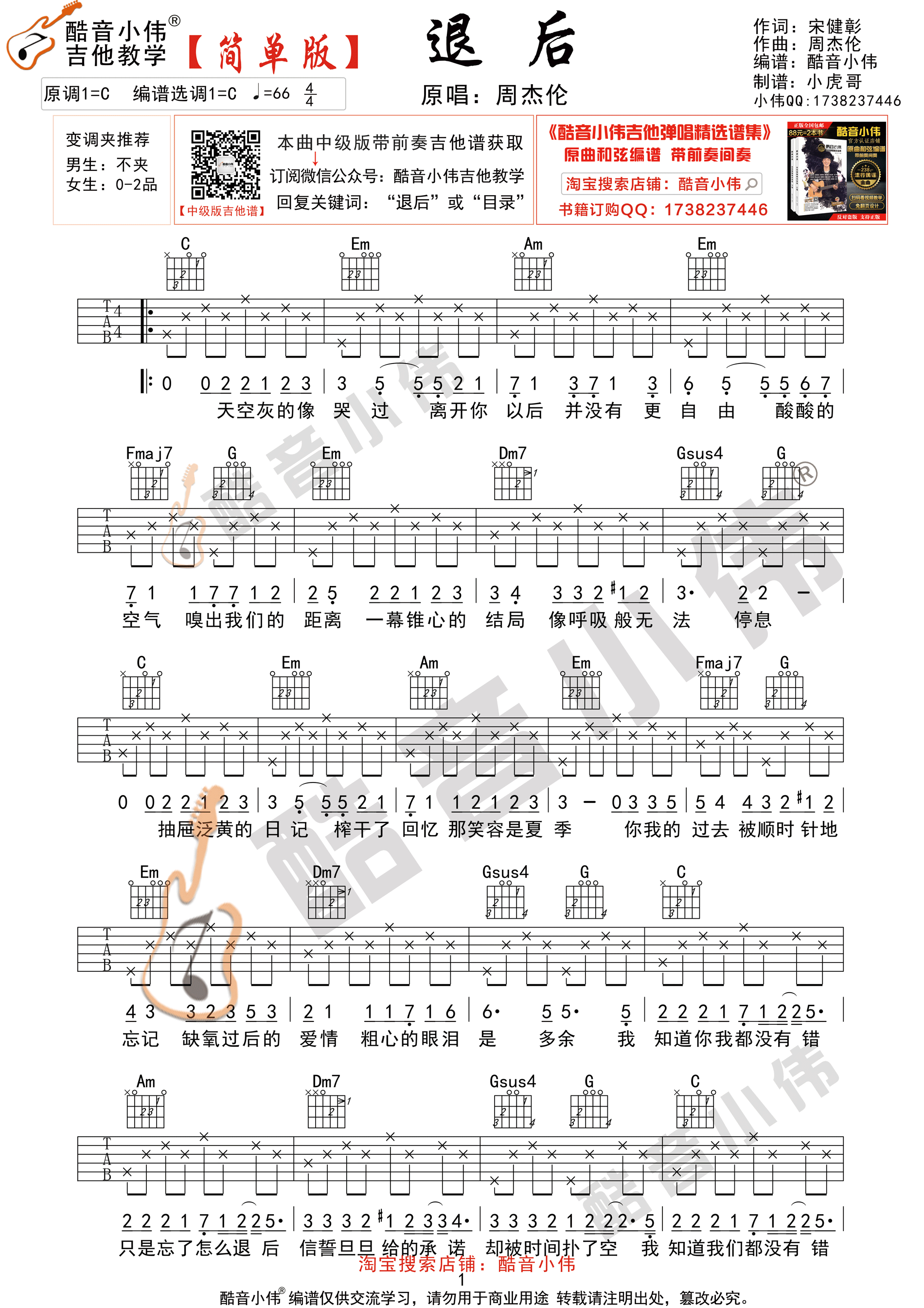 曲谱介绍: 《退后》是周杰伦演唱的歌曲,由宋健彰作词,周杰伦作曲,收录在周杰伦2006年发行的个人专辑《依然范特西》中。此曲获得了KKBOX在线音乐风云榜年度二十大单曲奖项。 《退后》由周杰伦作曲,南拳妈妈弹头作词。周杰伦表示,这首歌表达了每个爱过的人都曾有过的伤感与遗憾,创作这首歌曲是告诫大家不要将后悔留给自己,改变从现在开始。 《退后》是一首适合失恋时发泄的情歌,听完后气势磅礴,那种美好的伤感,如此这般的真切可感。歌曲中的旋律朗朗上口,旋律和歌词都有很强的代入感,从低吟的回忆开始,到中间进入失落的宣泄,一直到最后勉强的接受结局。中间出现的几句假声,也增加了作品的表现力。高潮部分打击乐的声音较明显.给人一种宣泄的畅快。周杰伦对这些假声、语气词的控制,都恰到好处,装饰着他的的嗓音,华丽中带着一点沧桑,成为一种出类拔萃的时尚。