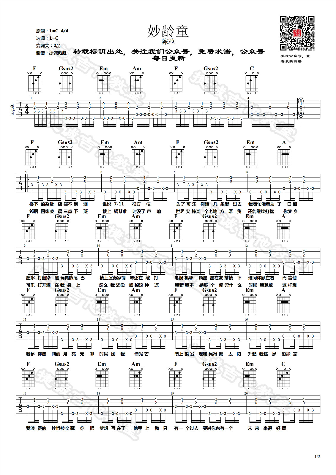 妙龄童吉他谱 - 陈粒 - 吉他独奏谱