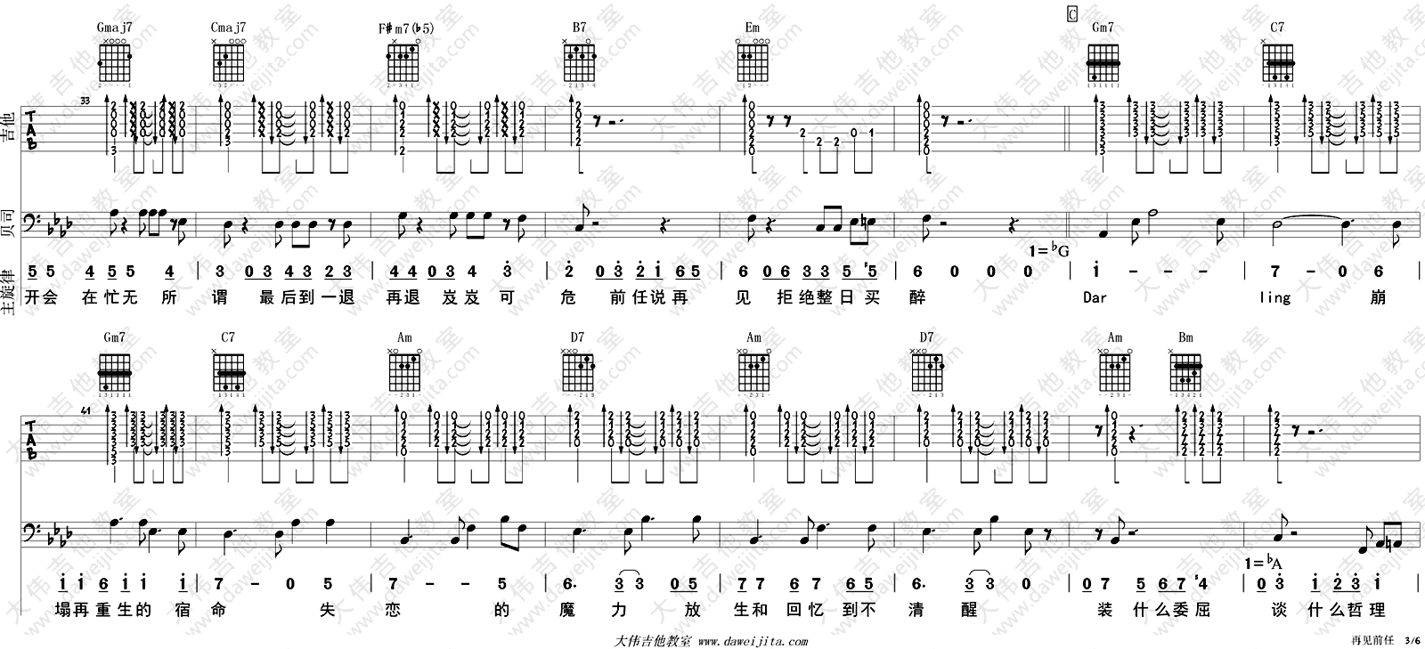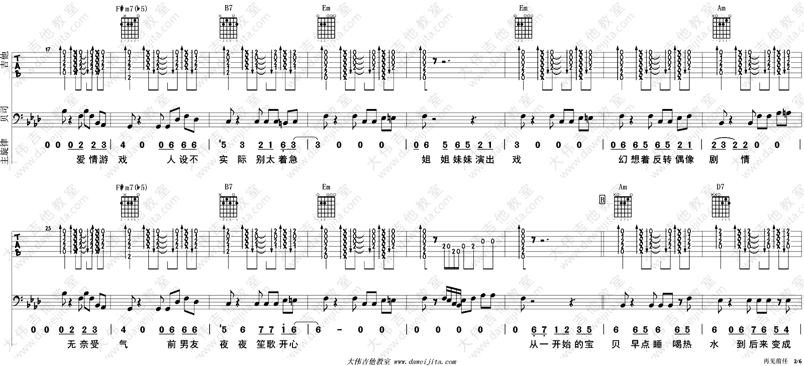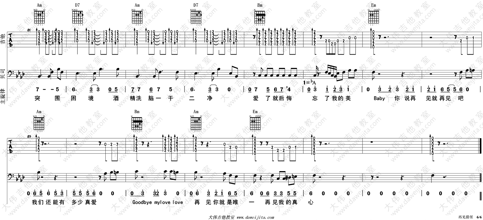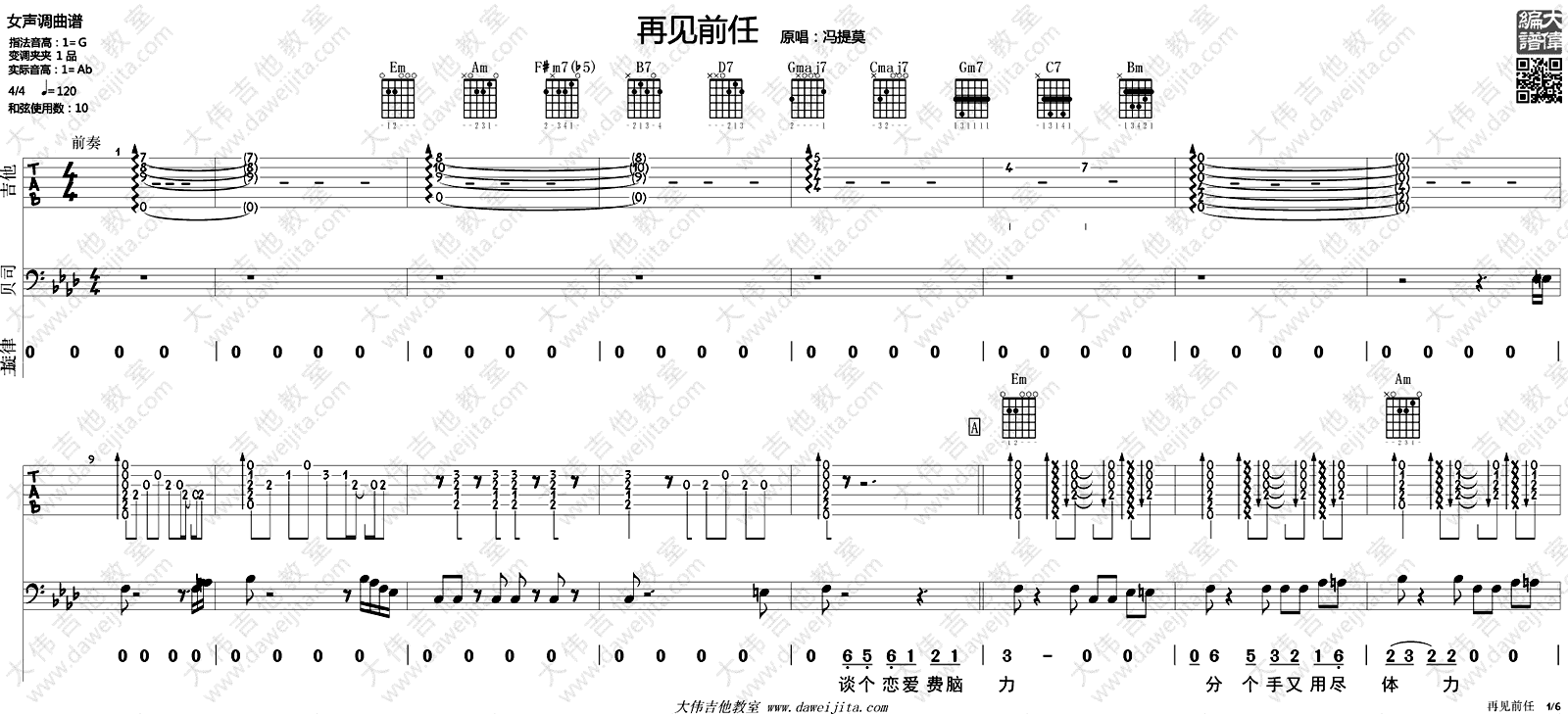 曲谱介绍: 《再见前任》是电影《前任3:再见前任》同名宣传曲,由孟令楠作词,刘洲作曲,冯提莫演唱,发行于2017年12月20日。 《再见前任》现实扎心又不乏幽默诙谐的歌词,搭配上冯提莫的演唱,唱出对前任说再见的决心。歌词“最后到一退再退岌岌可危,前任说再见,拒绝整日买醉”表达出女生面对分手的豁达;“爱了就后悔,忘了我的美,Baby你说再见就再见吧”则尽显新一代女性率性、独立的特点。 冯提莫《再见前任》吉他谱,女生调曲谱,G调指法,变调夹夹一品,电影同名宣传曲,再见前任六线谱,完整版共六张图片谱。大伟吉他编配出品。一首爵士韵味的歌曲,歌声娓娓道来,仿佛将感情中所经历的聚散离合一一诉说。