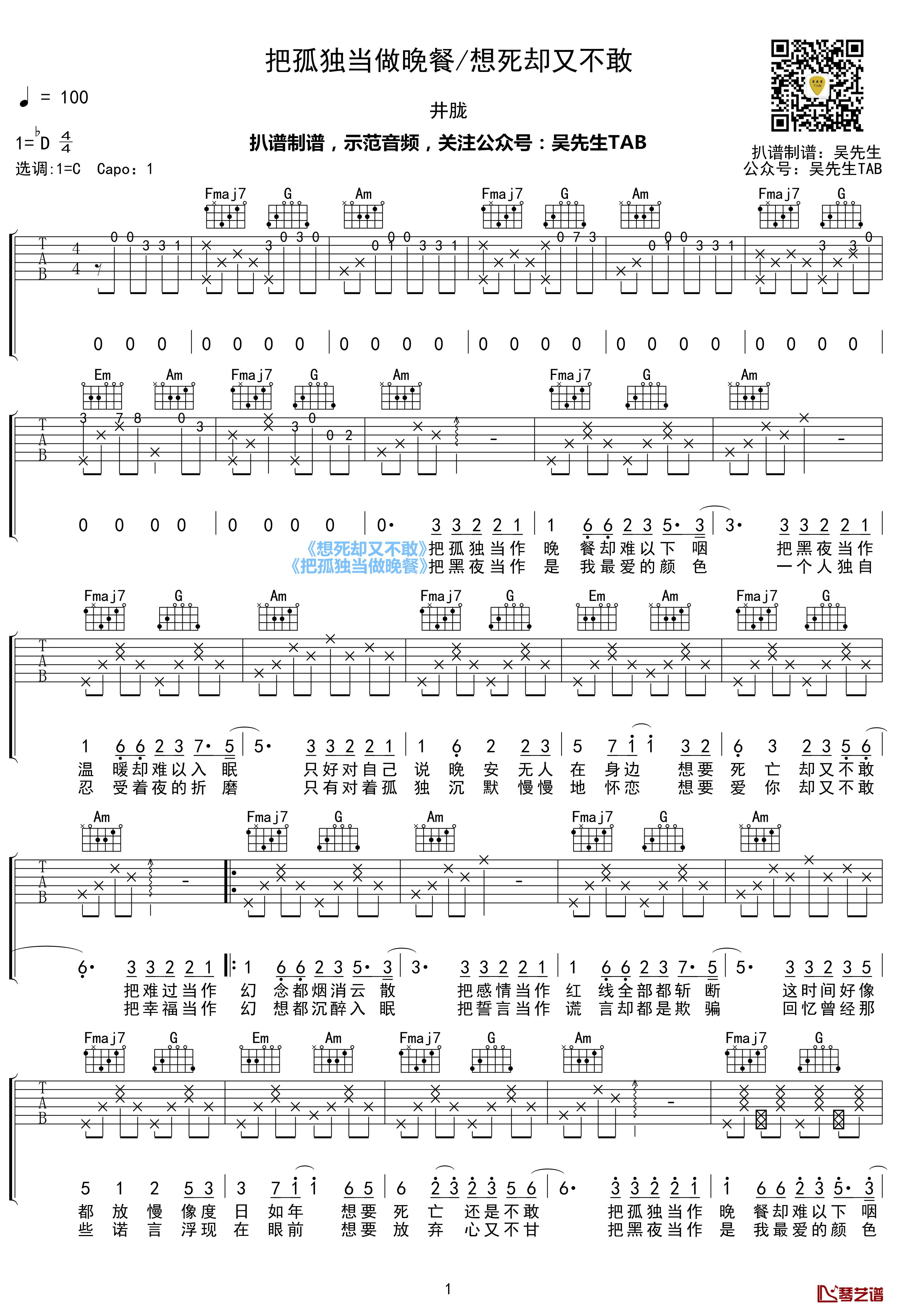 曲谱介绍:   最近抖音平台上又火了一首歌叫《把孤独当做晚餐》,原名叫《想死却又不敢》。    这首歌挺神奇的,我在搜索的时候发现有好几个版本,并且词曲的作者和演唱者写的都不一样。其中就有MC画词戏子作词作曲并演唱的《想死却又不敢》,后改名为《把孤独当作晚餐》。   和刘旭阳演唱,六少狼作词作曲的《把孤独当作晚餐》,歌名一模一样,歌词略有不同,和弦走向完全一样,并且副歌,也是大同小异。还有井胧演唱,残雪作曲,Ayler吴逸轩作词的《把孤独当做晚餐》,我没有打错字,歌名只有“作”和“做”一字之差,但是这首歌和MC画词戏子版本的《把孤独当作晚餐》是一模一样的,我不知道残雪和MC画词戏子是否是同一个人。   同样的歌曲,词曲作者不同,而且歌词也大同小异。所以我觉得这首歌特别神奇。所以我把《想死却又不敢》和井胧版本的《把孤独当做晚餐》并做成一个谱子,歌词分上下两行。