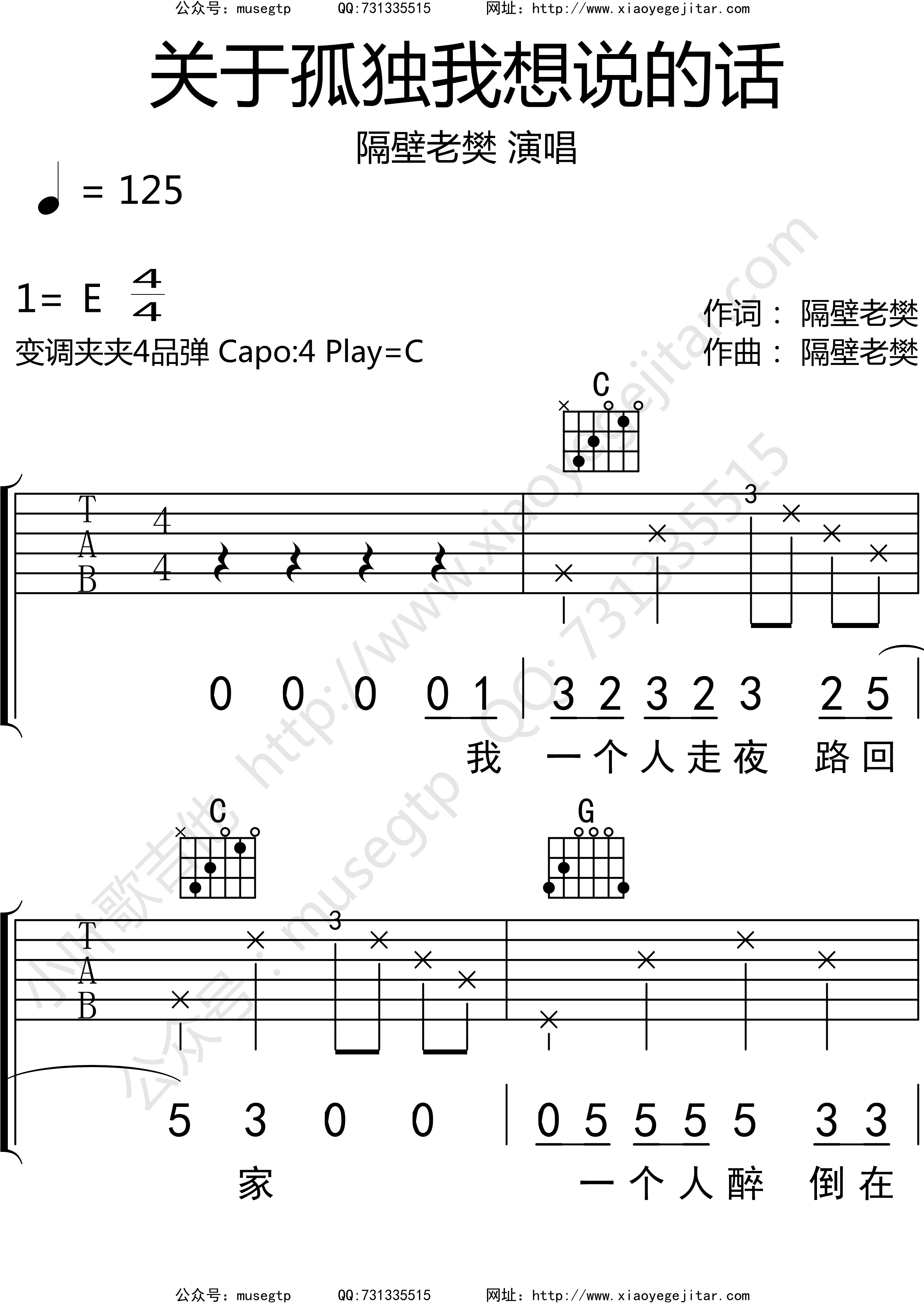 关于孤独我想说的话吉他谱 - 隔壁老樊 - C调吉他弹唱谱