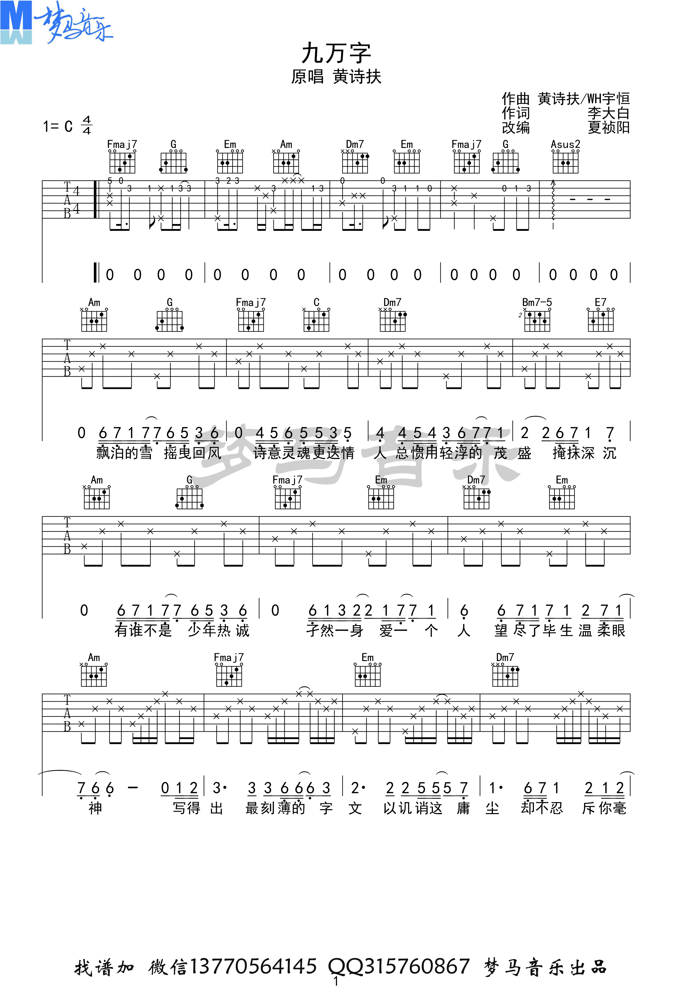 九万字吉他谱 - 黄诗扶 - 吉他弹唱谱