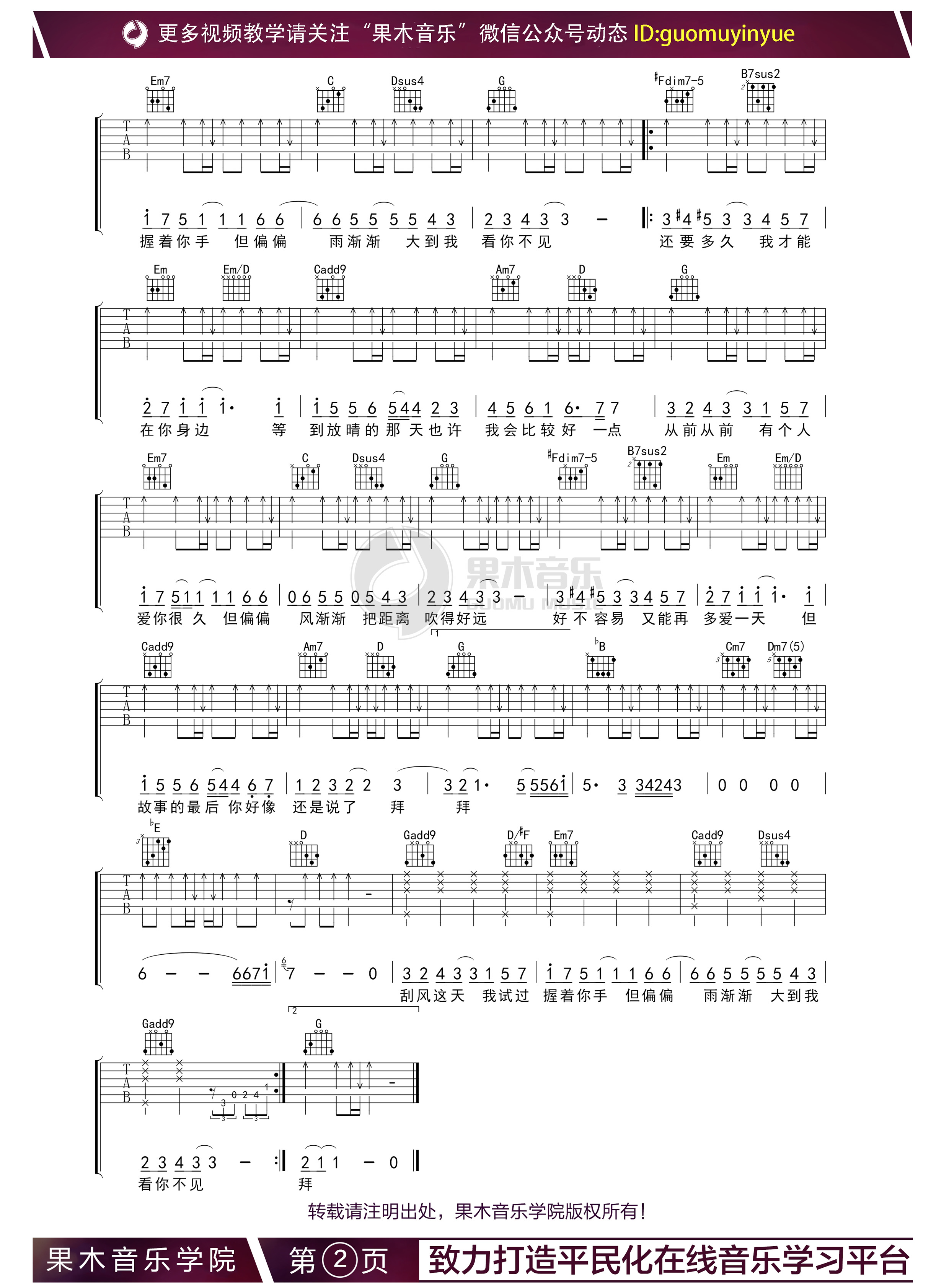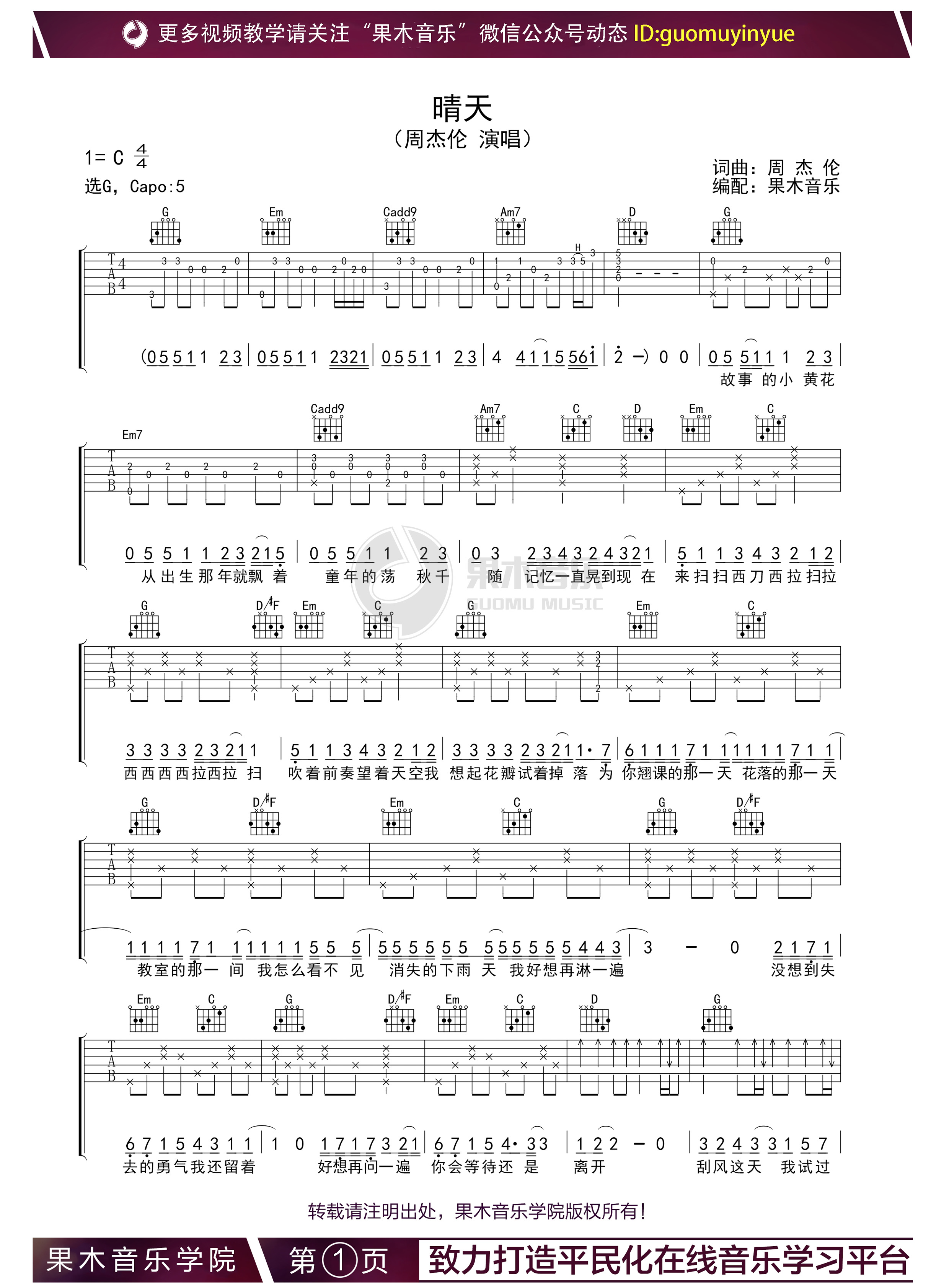 晴天吉他谱 - 周杰伦 - 吉他独奏谱
