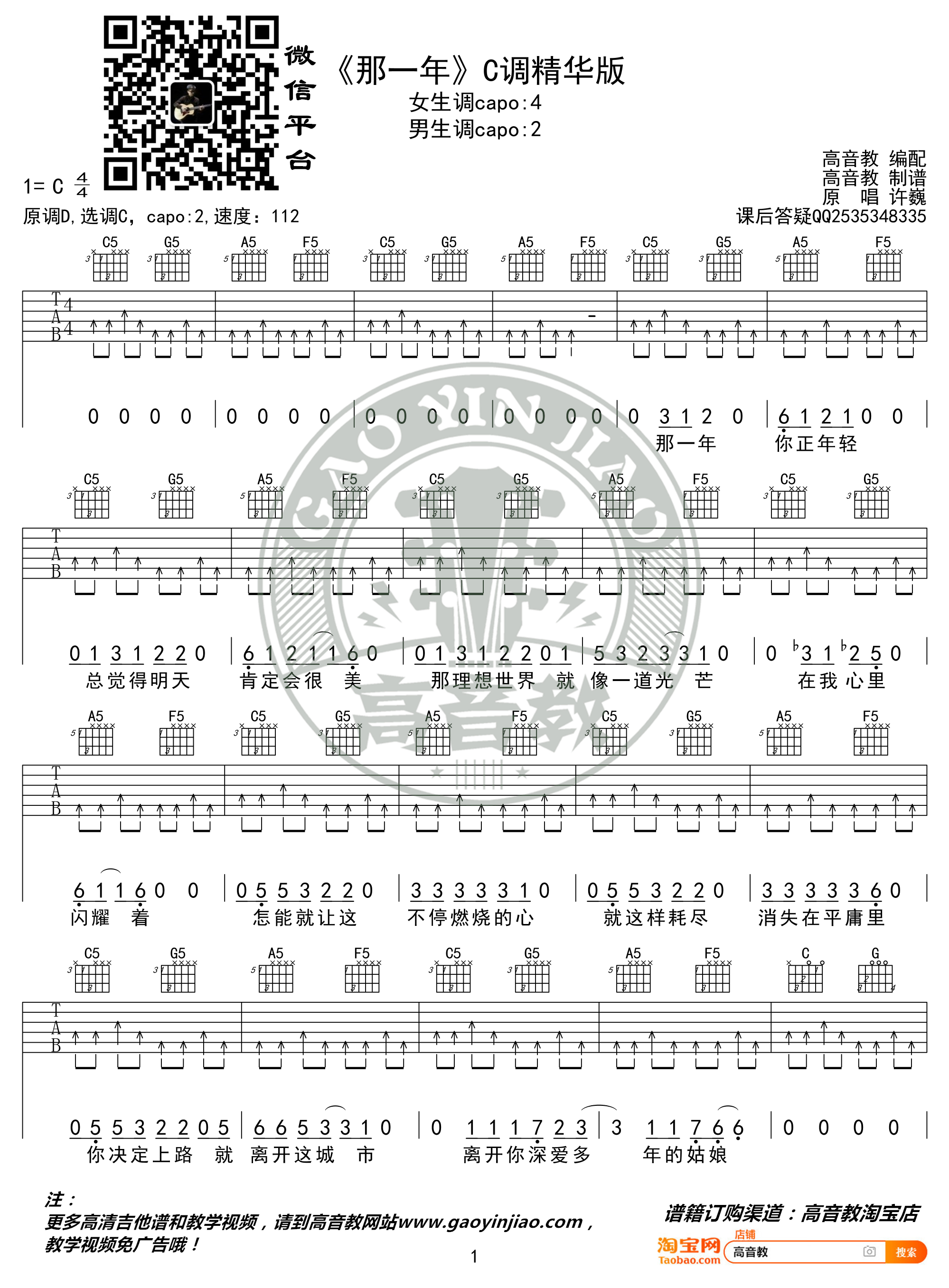 曲谱介绍: 那一年吉他谱,歌曲原调D调,选用C调指法编配,弹奏时候变调夹夹2品,那一年吉他精华版,许巍早先年歌曲,那一年弹唱六线谱,曲谱由高音教编配,猴哥吉他教学出品。