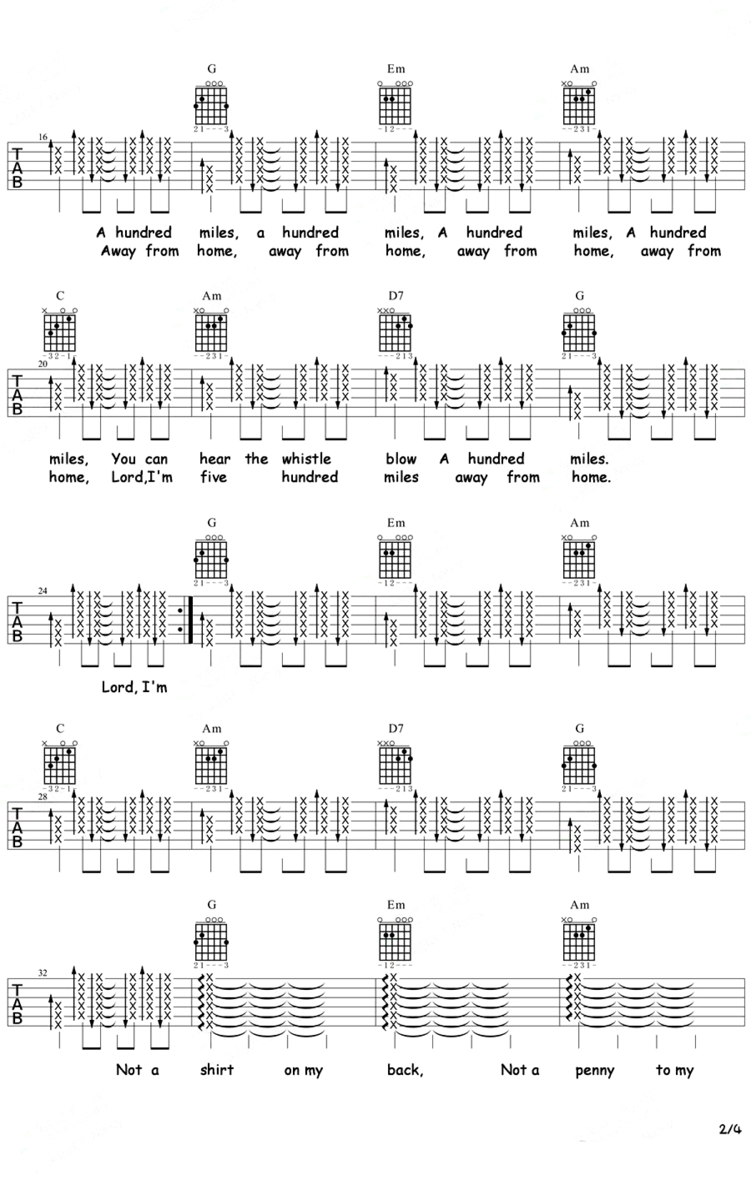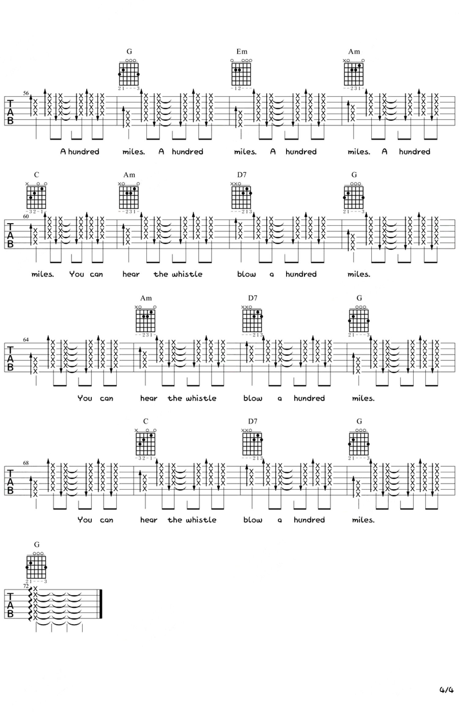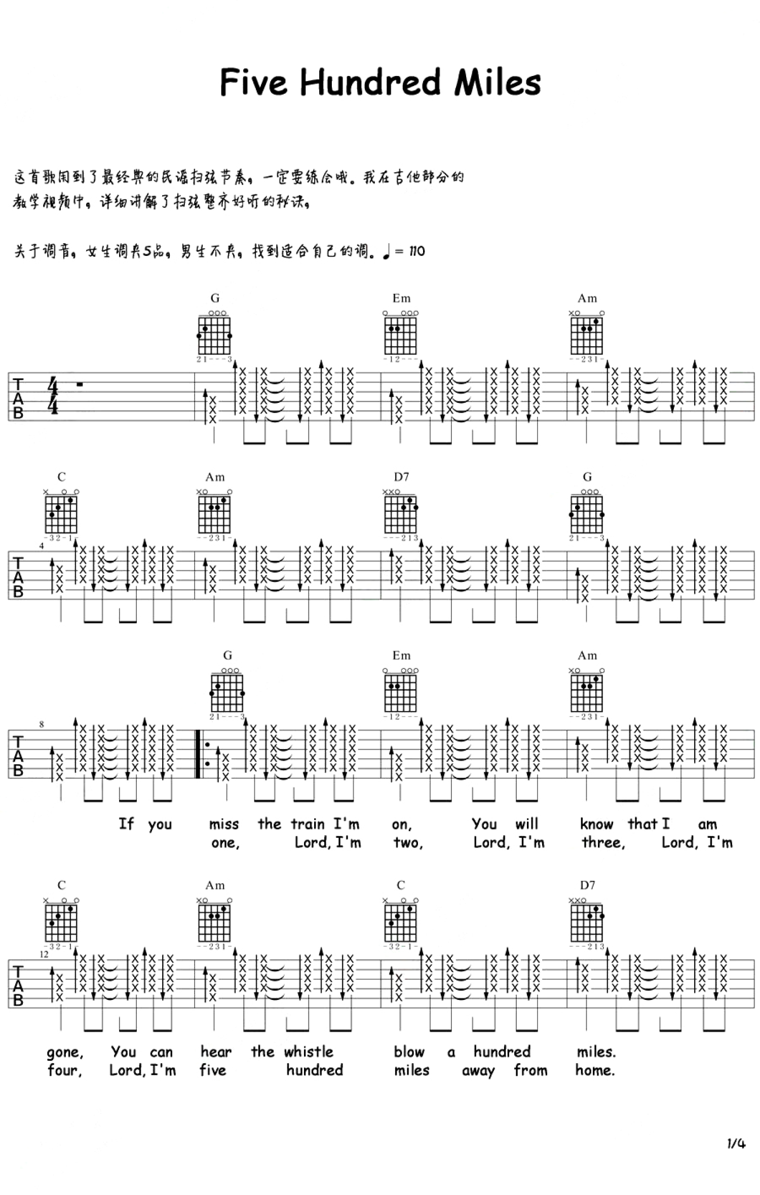 曲谱介绍: FiveHundredMiles吉他谱,六线谱编配,完整版图片谱,500miles吉他谱,这首歌曲用到了经典的民谣扫弦节奏。一定要练会哦。关于调音,男生调不夹,女生调夹五品,琴友们找到适合自己的调。随谱附上呆萌妹子老师的FiveHundredMiles吉他弹唱教学,视频详细讲了扫弦整齐好听的秘诀,如果你的扫弦很杂乱,这个教学一定要看哦!一首英文经典民谣歌曲,FiveHundredMiles吉他六线谱,悠扬舒缓的旋律让人忘却凡尘所有的忧愁,感觉一切都是那么的美。(责任编辑:打谱啦网)