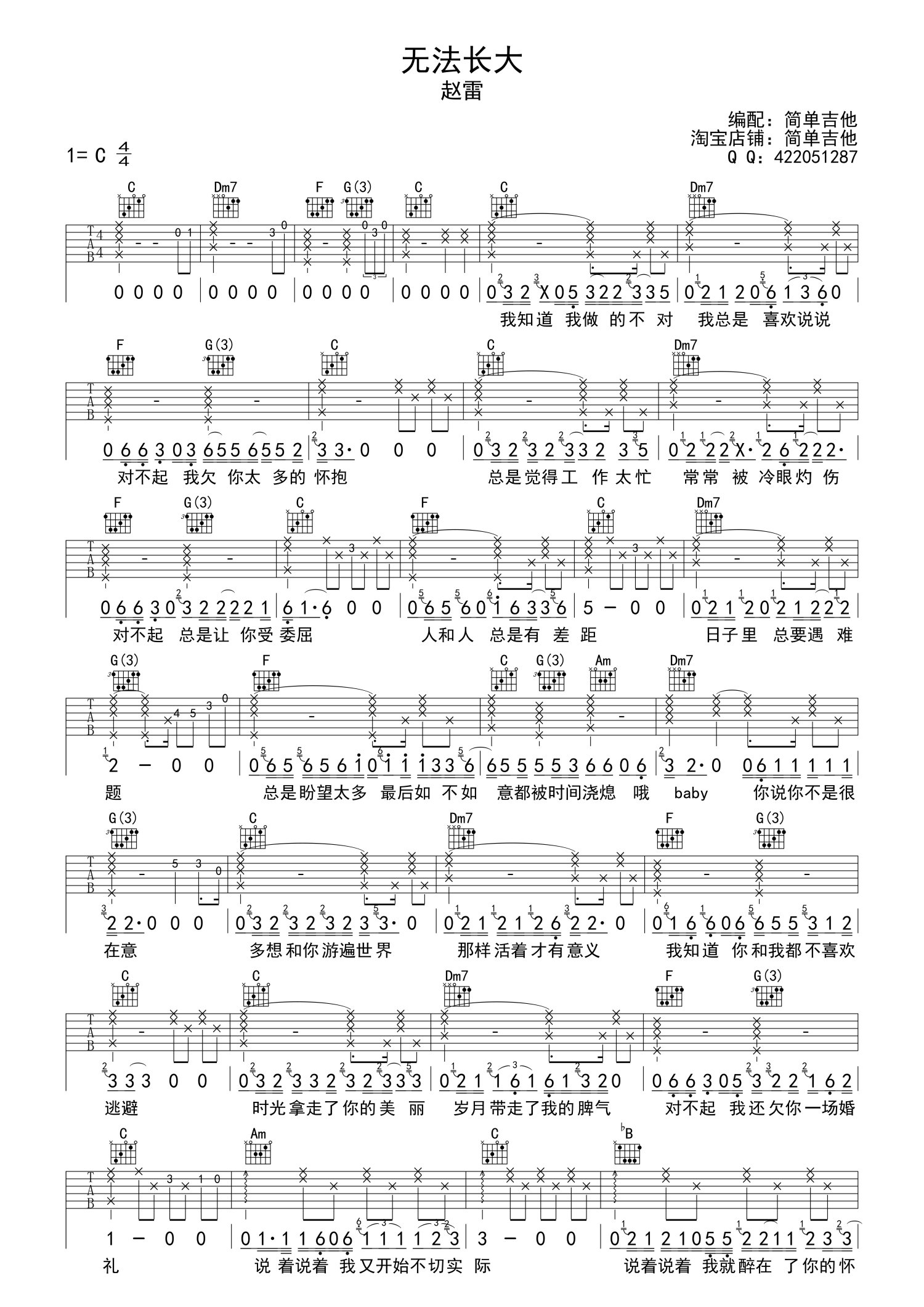 • 无法长大吉他谱 - 赵雷 - C调吉他弹唱谱第1张