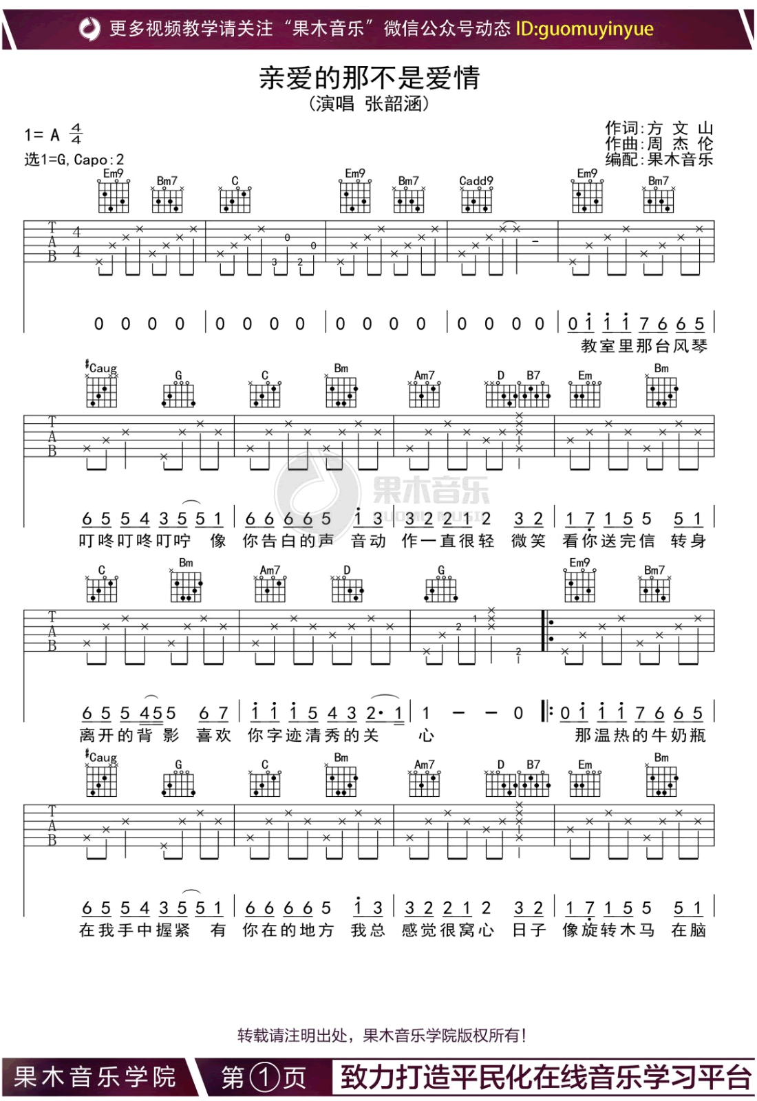 曲谱介绍: 亲爱的那不是爱情吉他谱,张韶涵演唱,一首由周杰伦为张韶涵特地量身打造经典老歌,亲爱的那不是爱情六线谱,原调A,选用G调指法,变调夹夹第二品,果木音乐编配出品,琴谱网网更新上传。