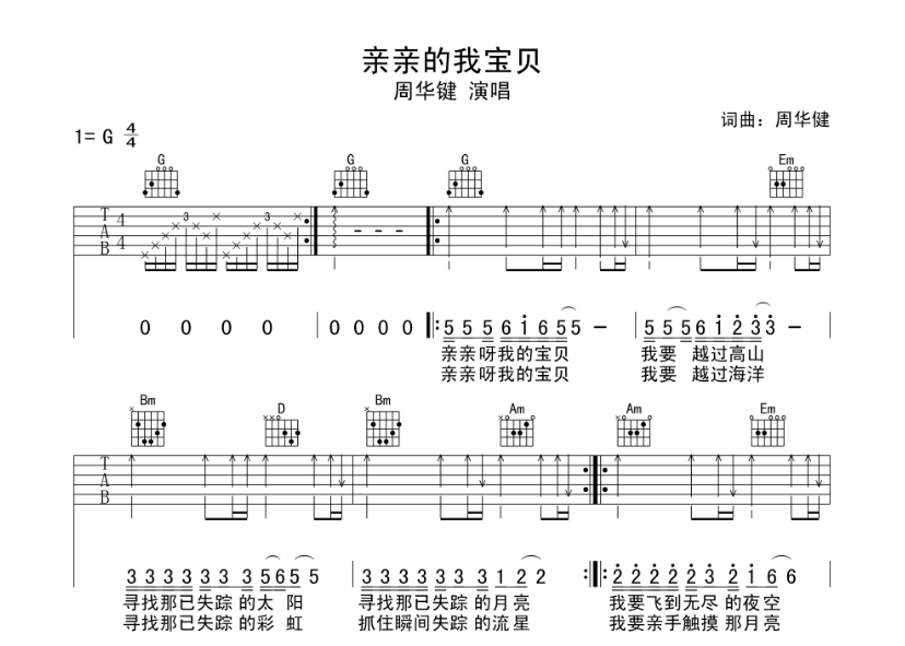 曲谱介绍: 周华健《亲亲我的宝贝》吉他谱G调《亲亲我的宝贝》是周华健演唱的一首歌曲,由周华健作词、作曲,鲍比达编曲,收录在周华健1990年12月19日发行的专辑《不愿一个人》中。