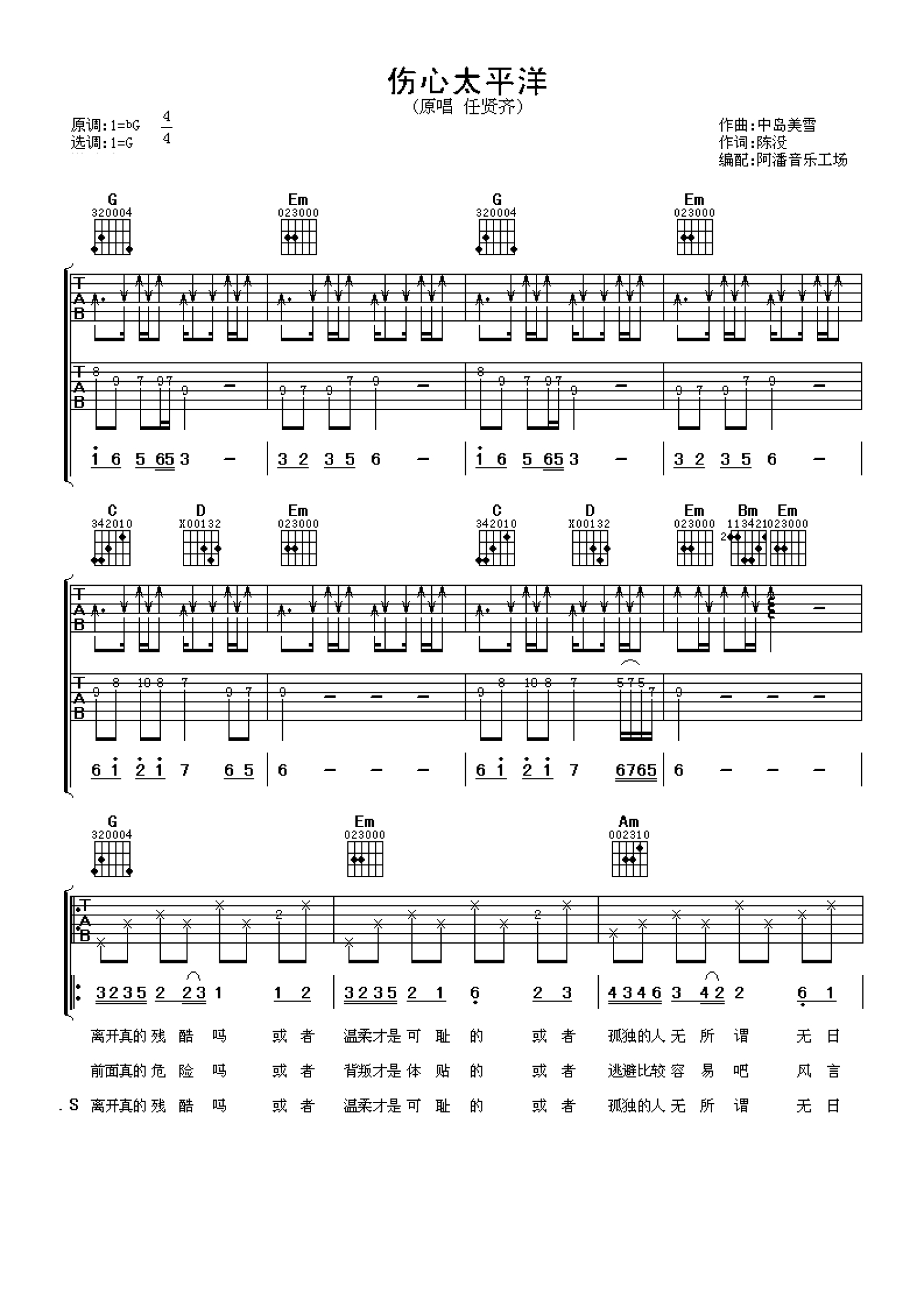 曲谱介绍: 任贤齐伤心太平洋吉他六线谱:非常经典的翻唱歌曲,改编自日本中岛美雪原曲。任贤齐伤心太平洋吉他谱,原调bG选调G调,图片吉他谱共五页完整版。