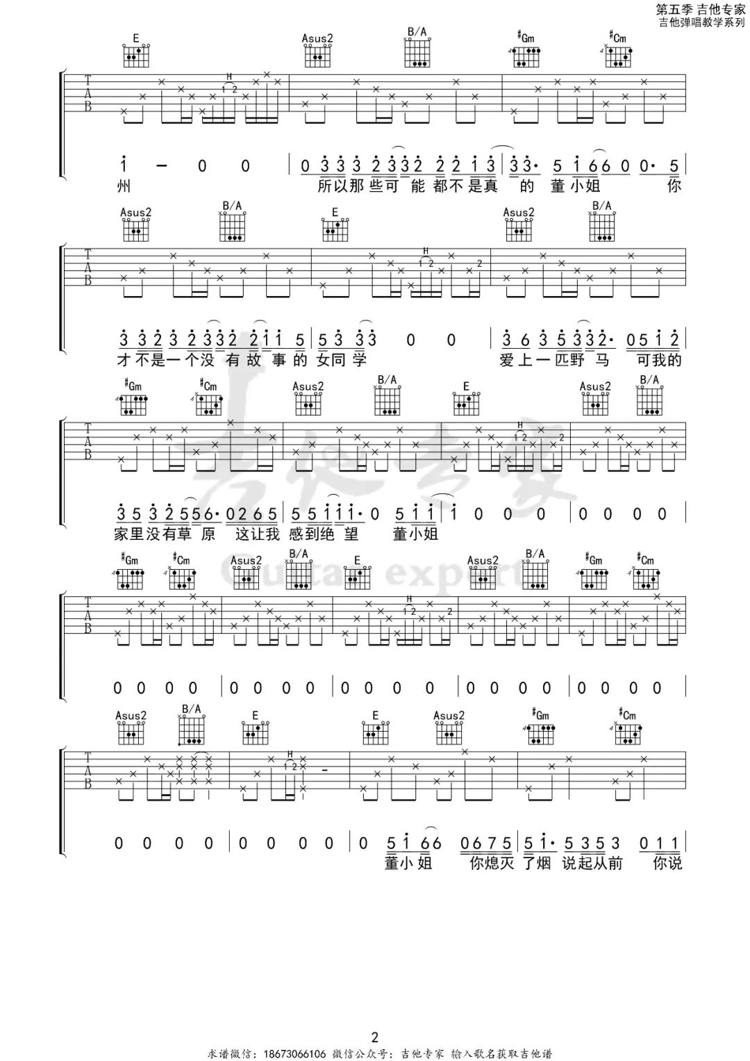 曲谱介绍: 吉他谱介绍:董小姐吉他谱,宋冬野演唱的一首歌曲,4/4拍的节奏,这首歌曲的原调为E调,这里曲谱采用了E调指法进行编配,演唱时可不夹变调夹,曲谱由琴谱网更新上传,共2张高清图片弹唱吉他谱例,来源于@吉他专家编配出品。这首歌的创作灵感来源于宋冬野身边一名姓董的摄影师朋友的情感故事。那时董老师爱上一个人,宋冬野在听了董老师的情感经历后,内心有感而发,于是创作出了这首歌词和旋律都很简单让人容易记住的歌曲。
