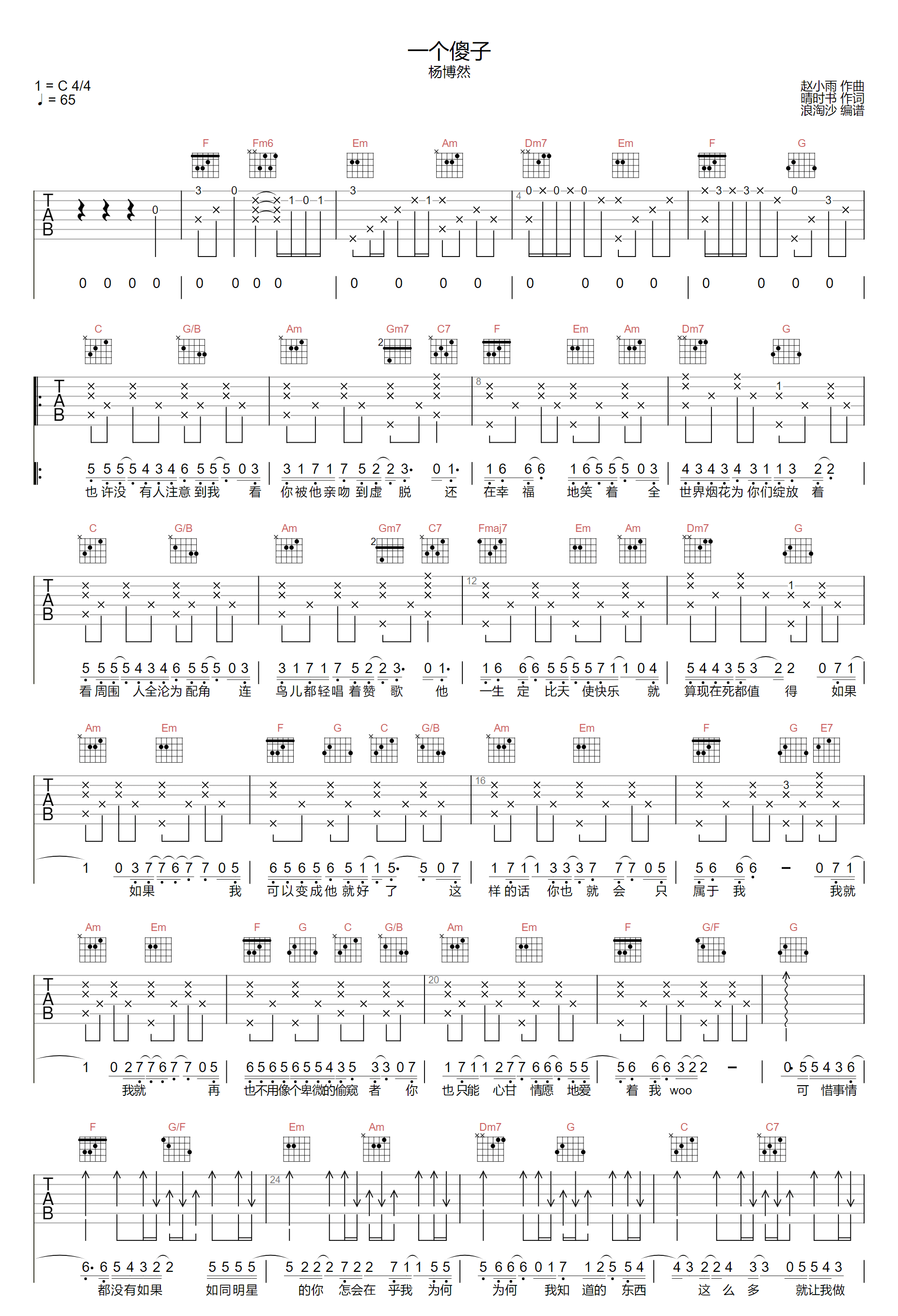 一个傻子吉他谱 - 杨博然 - C调吉他弹唱谱 - 原版