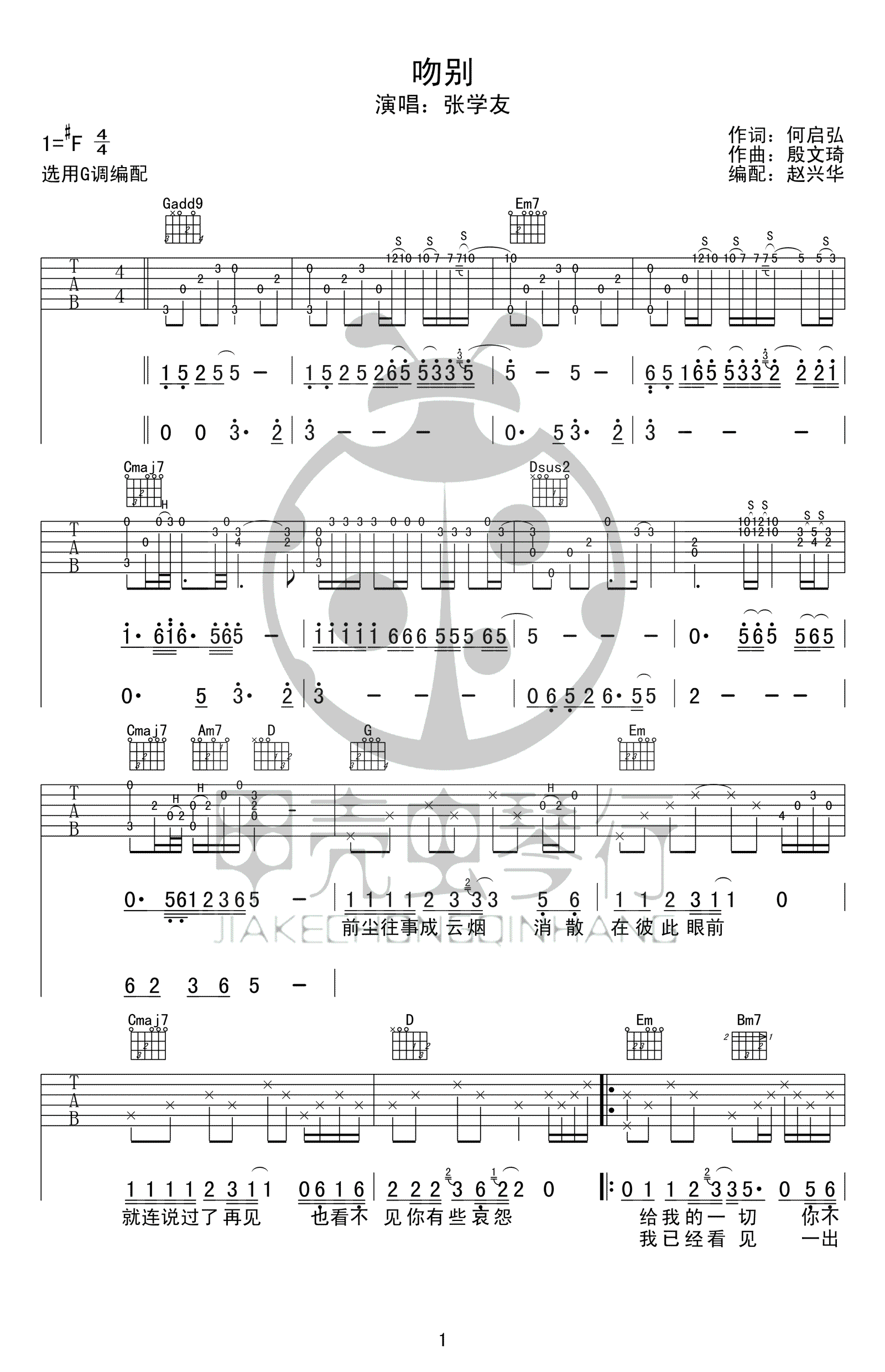 曲谱介绍: 吻别吉他谱,一首张学友经典老歌,原调#F调,选用G调指法编配,吻别六线谱,完整版高清图片谱共五张谱例。感谢赵兴华编配,91吉他谱网站上传推荐。 张学友《吻别》曾经不知听哭了多少痴情男女,这是一个时代的烙印,承载了很多人的回忆和感动 。熟悉的旋律让人回想起那些美好的时光,让我们随着歌声穿越时光隧道,回到我们的青葱岁月去吧。
