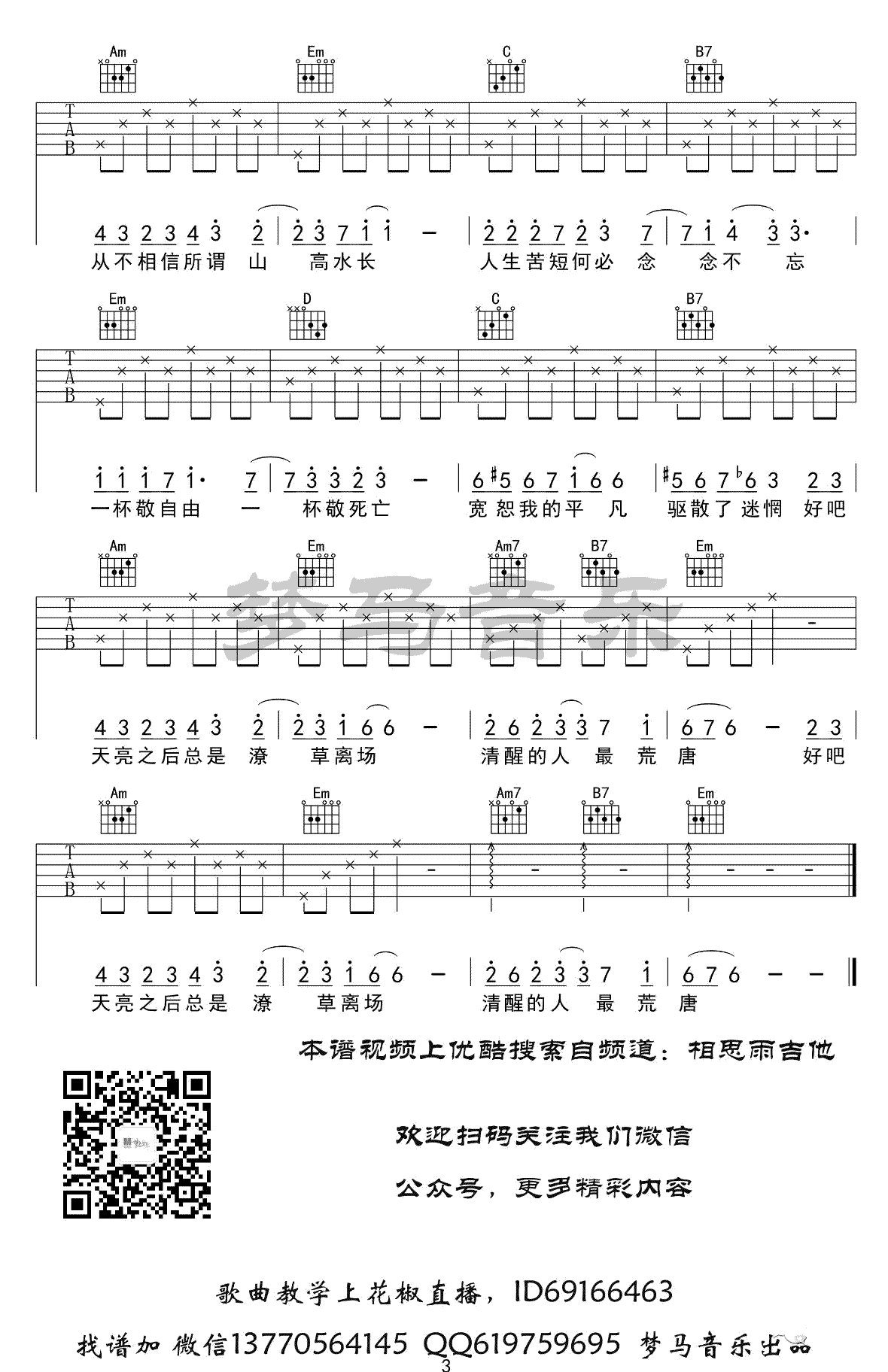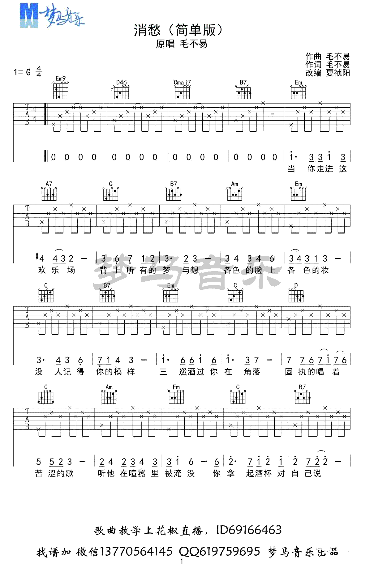 曲谱介绍: 消愁吉他谱,G调指法,简单版弹唱谱,毛不易的一首热门歌曲《消愁》六线谱,三张高清图片谱。感谢梦马音乐编配出品,91吉他谱为琴友们上传分享。随谱附上配套弹唱教学视频。整首歌非常简单,没有复杂的节奏型,没有复杂的和弦,甚至连横按也没有。特别适合刚开始学习和弦的琴友。虽然简单,但是视频录出来的效果大家反映都不错的。