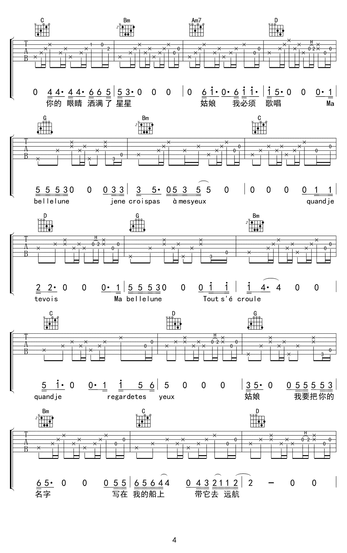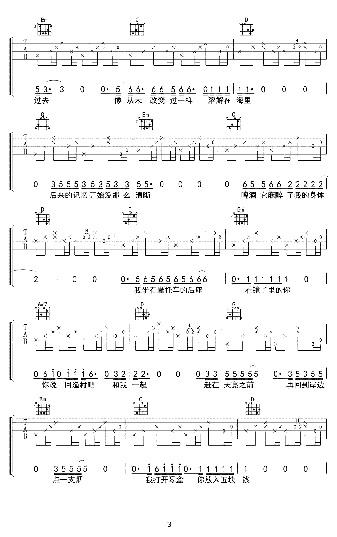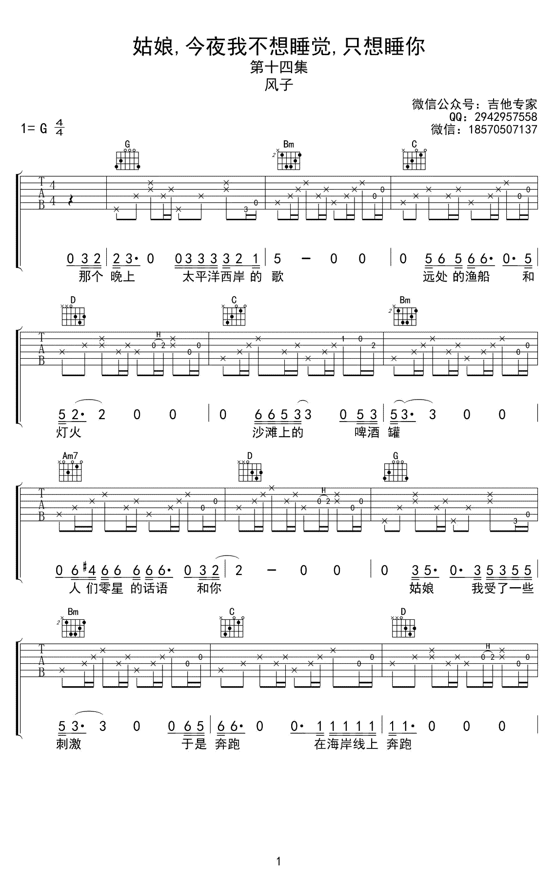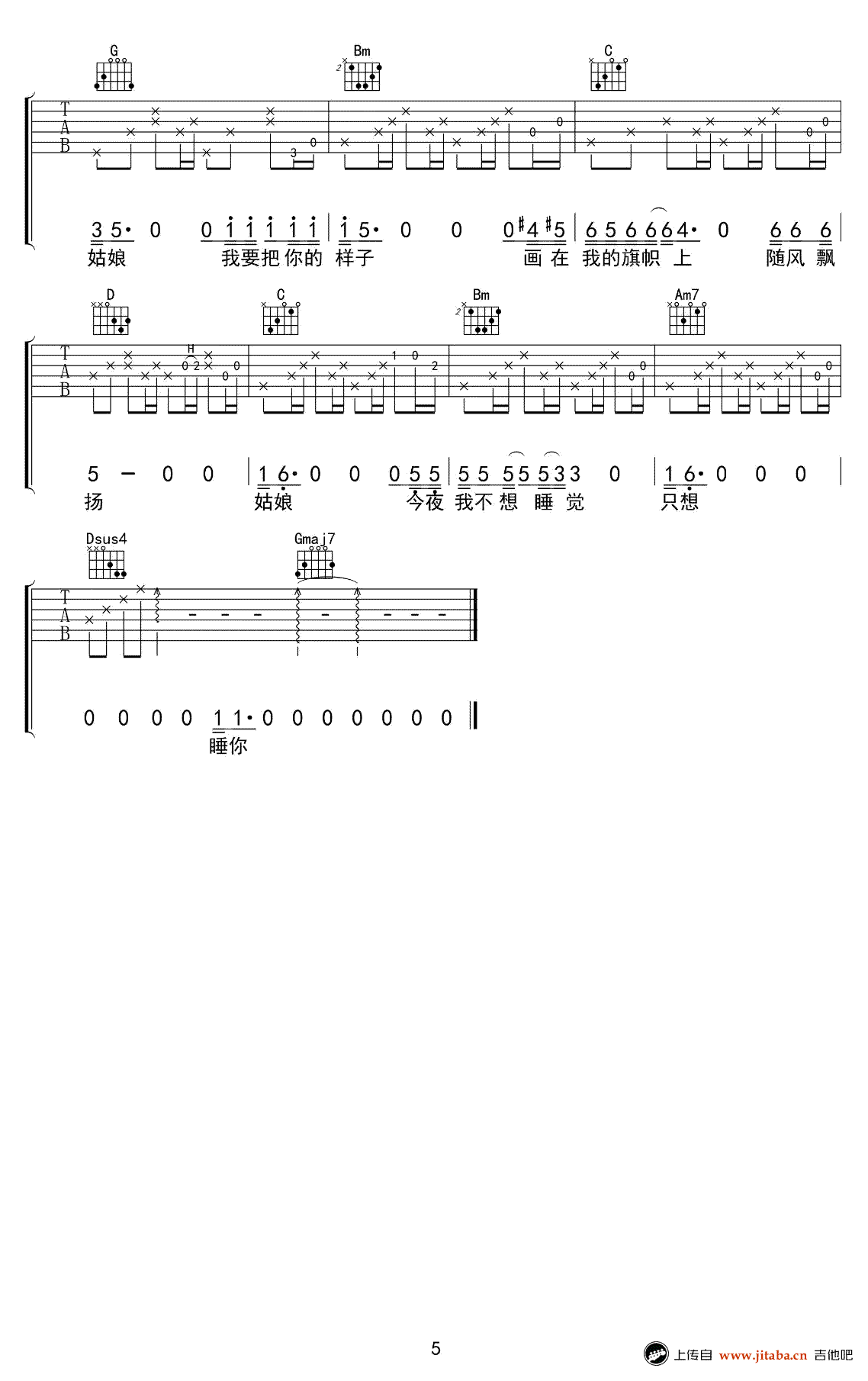 曲谱介绍: 姑娘,今夜我不想睡觉,只想睡你吉他谱,风子演唱,G调指法,高清弹唱六线谱,完整版共五张图片谱。感谢音艺出品,91吉他谱网站推荐上传。这首歌曲其实很简单,就这么几个最基础的和弦,右手的节奏可以随意一点,不需要看谱子来。 这是一个长长的故事,且听他慢慢给你道来。歌名虽小污,但听起来并不污,很安静的民谣。