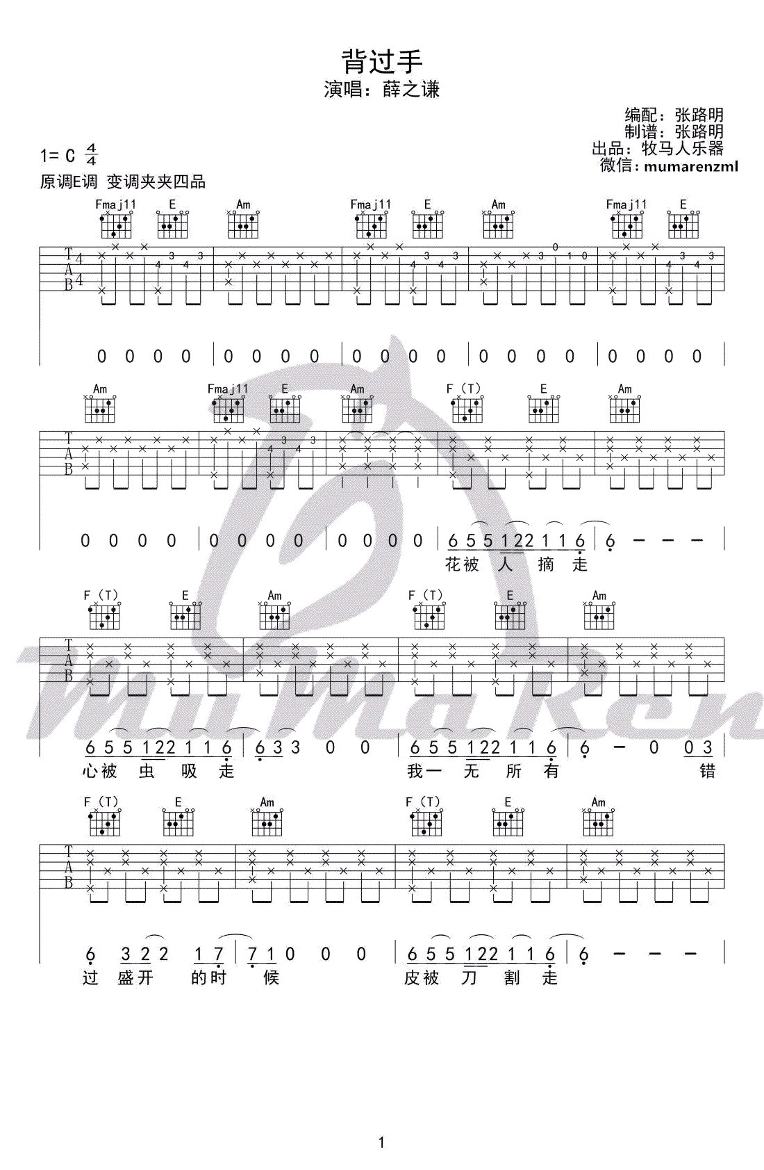 曲谱介绍: 背过手吉他谱,薛之谦词曲创作演唱的新歌《背过手》六线谱,原调E,变调夹夹四品,选用C调指法。本曲谱完整版共五张图片谱例,感谢张路明老师编配制谱,91吉他谱网站上传收藏。