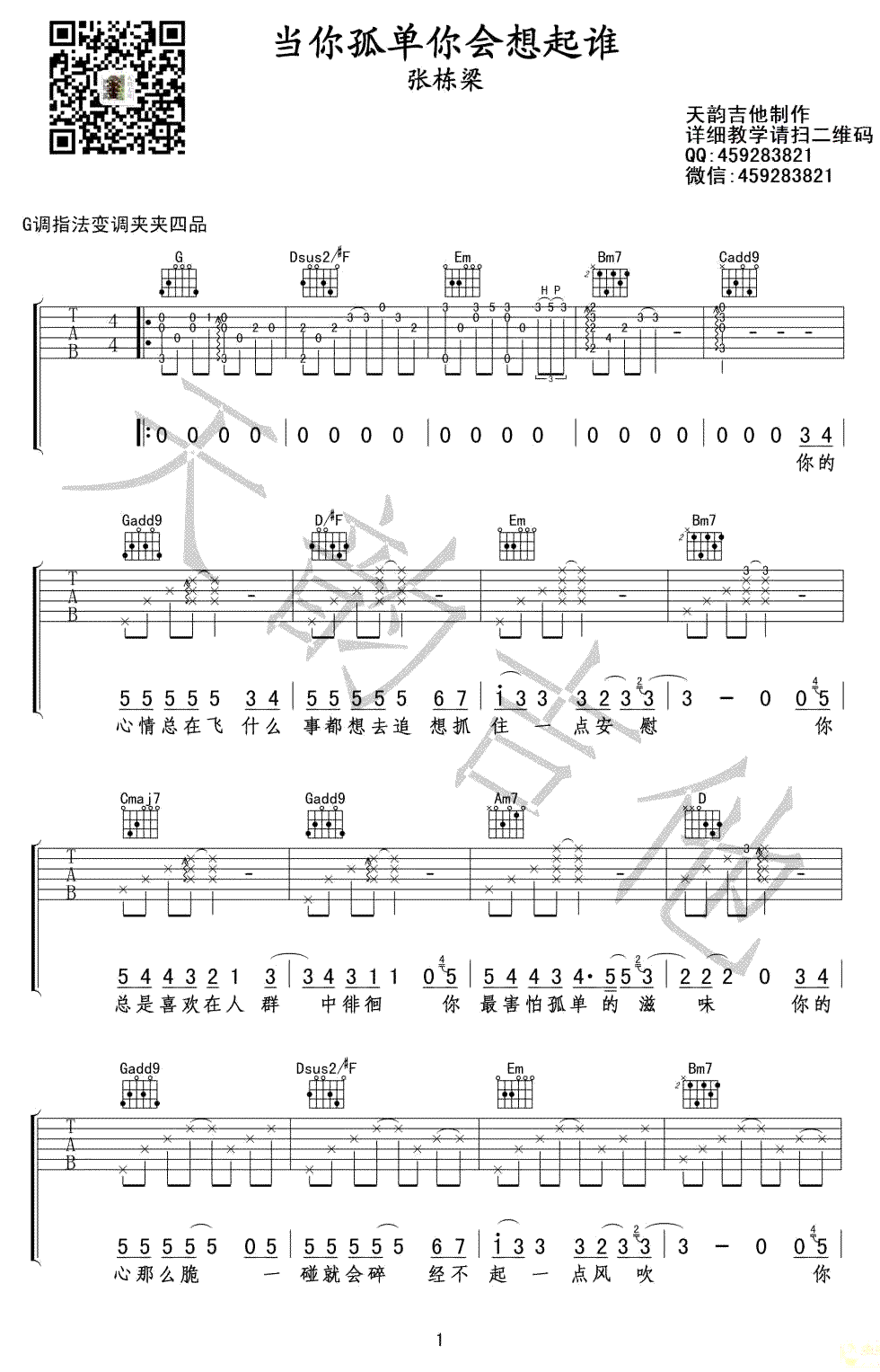 曲谱介绍: 张栋梁《当你孤单你会想起谁》吉他谱,G调指法,变调夹夹四品。当你孤单你会想起谁六线谱,三张图片谱例,天韵吉他分享,91吉他谱网站上传。 一首曾经红遍大街小巷的歌曲,熟悉的旋律,温暖的歌声,是否依然能够让你感受一份慰藉,当歌单随意播放到这首歌,好久没听。再听心一颤,鼻子一酸。一晃那么多年,很想念……