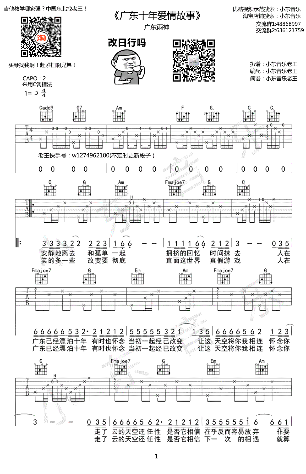 曲谱介绍: 广东十年爱情故事吉他谱,广东雨神演唱的一首开始在网络受到热播欢迎的歌曲,广东十年爱情故事六线谱,原调D,CAPO夹二品,采用C调指法编配。高清弹唱谱共三张图片,感谢小东音乐出品,91吉他谱推荐上传。 听一首歌怀念一座城,一个人。最纯朴的爱情,最后抵不过现实,甜蜜过痛苦过、快乐过失去过,最后的结果,留给自己的只是一个人怀念,一个人回味。