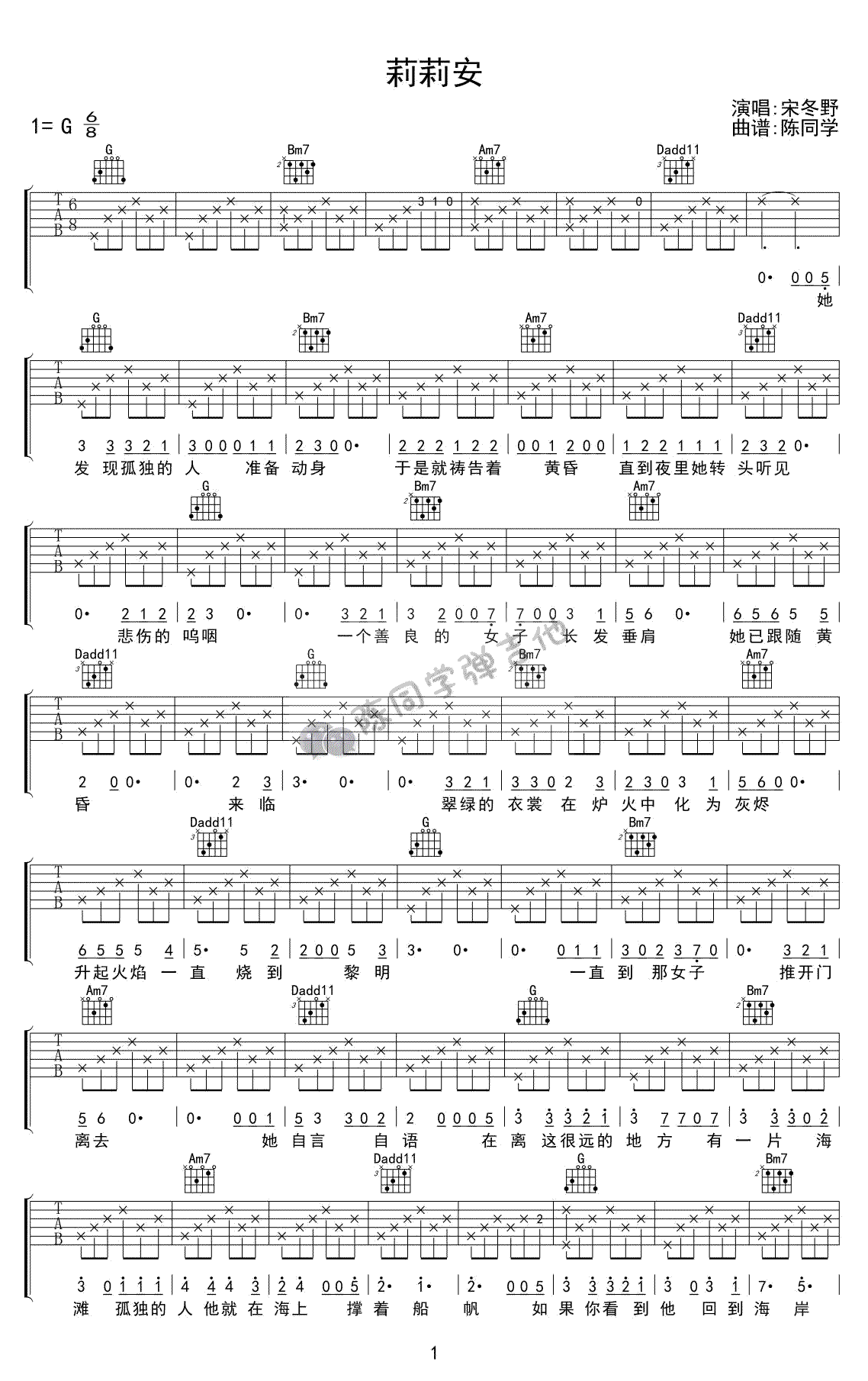 曲谱介绍: 莉莉安吉他谱,宋冬野的代表民谣作品,G调指法,高清图片谱。莉莉安六线谱,感谢陈同学编配,91吉他谱上传推荐,随谱附上吉他弹唱演示视频,琴友们参照练习。陈老师的话:整首歌只有4个和弦进行,跟宋冬野的其他歌一样,曲式都很简单,弹奏起来不难,难的是唱,要唱出原曲的味道一点也不简单!需要注意的是吉他的节奏得慢,我在弹唱的时候速度有些快了,失去了一些味道。