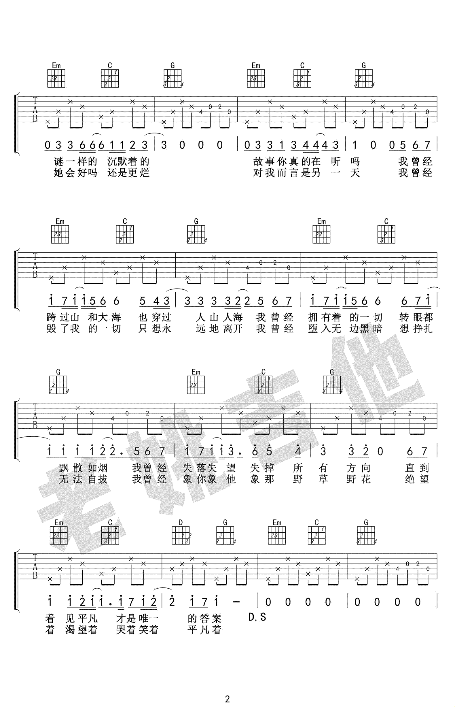 平凡之路吉他谱 - 朴树 - G调吉他弹唱谱