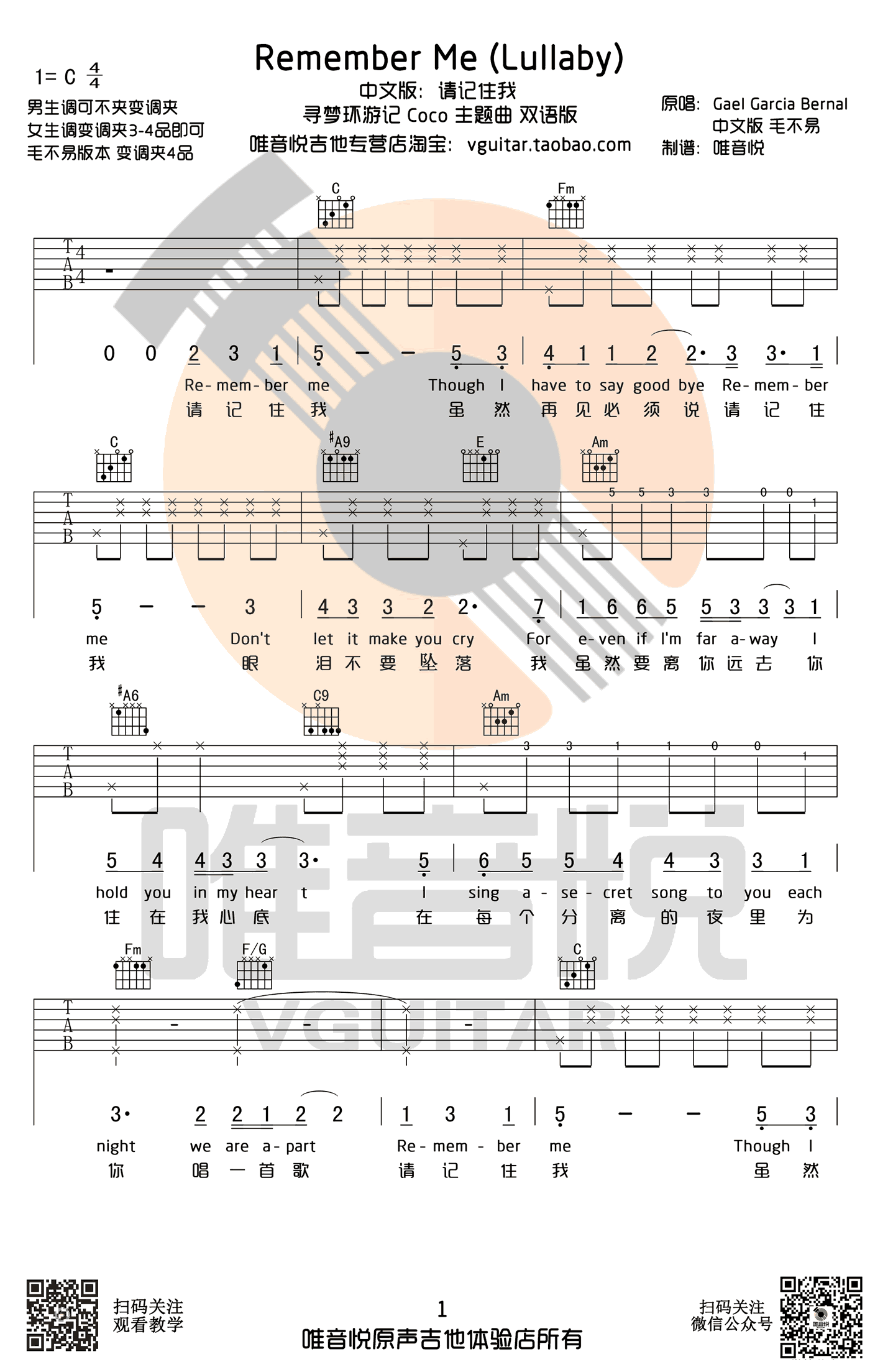 曲谱介绍: remember me吉他谱,电影《寻梦环游记》主题曲,请记住我吉他谱,C调简单版编配,男生调不用变调夹,女生建议变调夹夹3-4品,毛不易中文版版变调夹夹四品。曲谱为双语版,感谢唯音悦制谱,91吉他谱网站上传推荐。