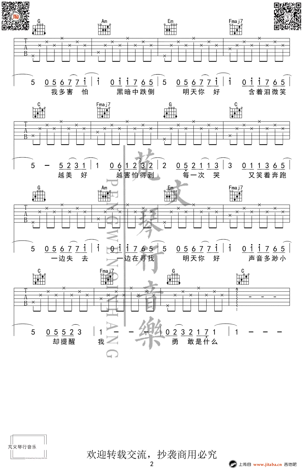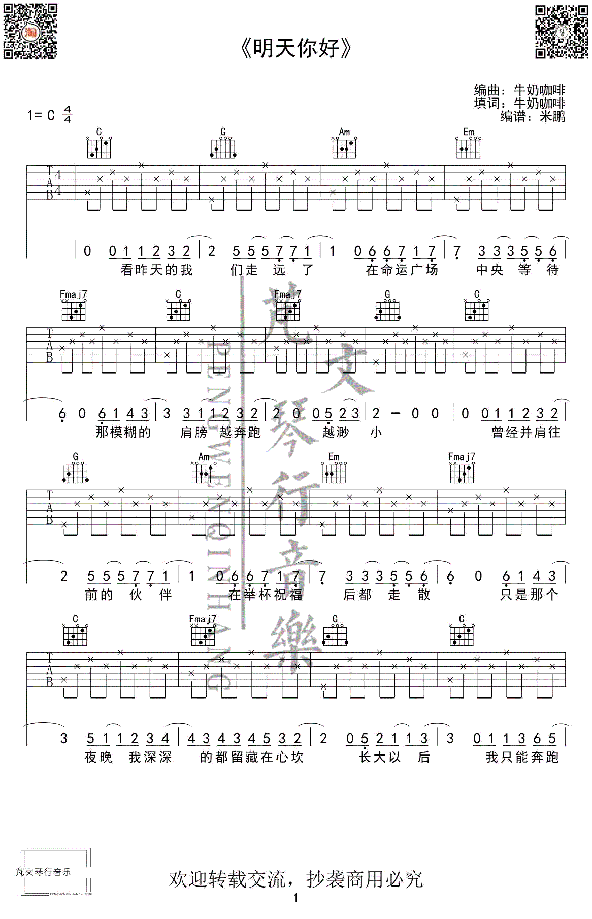 曲谱介绍: 明天你好吉他谱,C调指法,牛奶咖啡演唱的的一首经典代表作品,明天你好六线谱,高清弹唱图片谱,感谢米鹏编配,91吉他谱网站上传推荐。本曲谱适合初学者,仅适合练手。