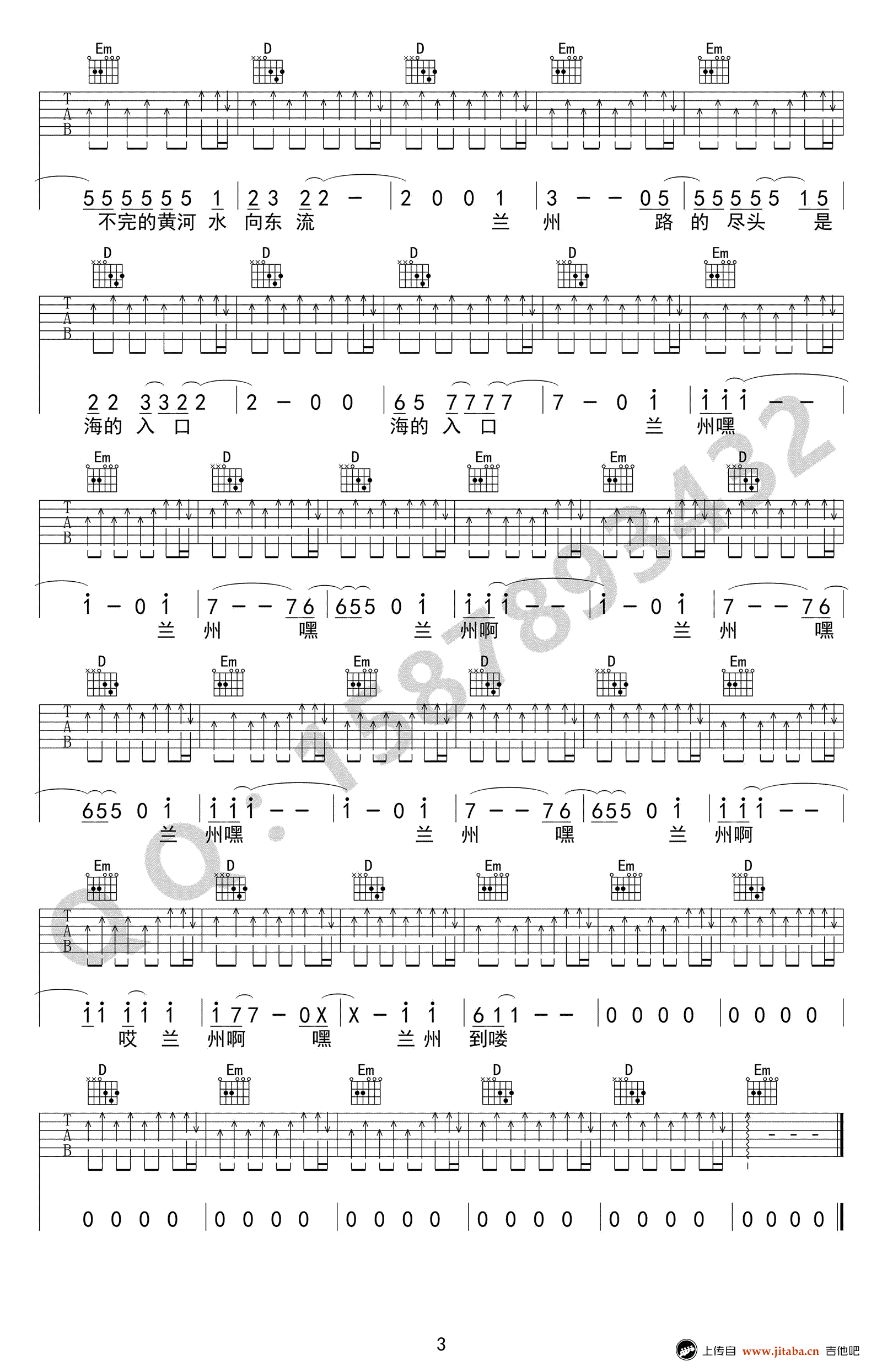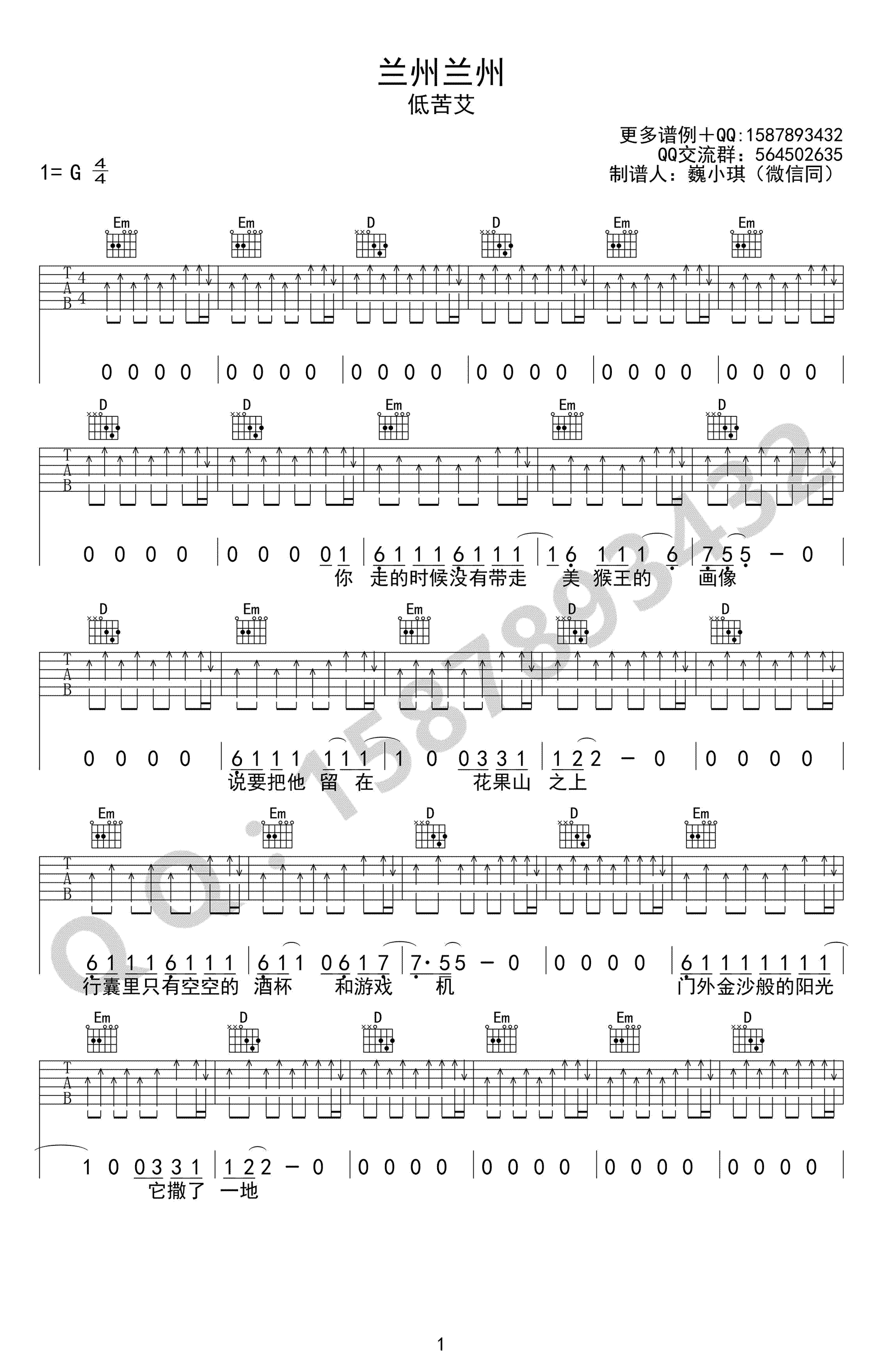 曲谱介绍: 低苦艾《兰州兰州》吉他谱,G调高清弹唱谱,三张图片谱,兰州兰州六线谱,巍小琪制谱,91吉他谱网站上传分享。 一首民谣摇滚《兰州兰州》,来自低苦艾乐队,歌曲用满怀感情的歌词唱出了兰州的美,唱出了一个城市的情怀,这是一座黄河穿城而过的家园,灵魂的栖息地。