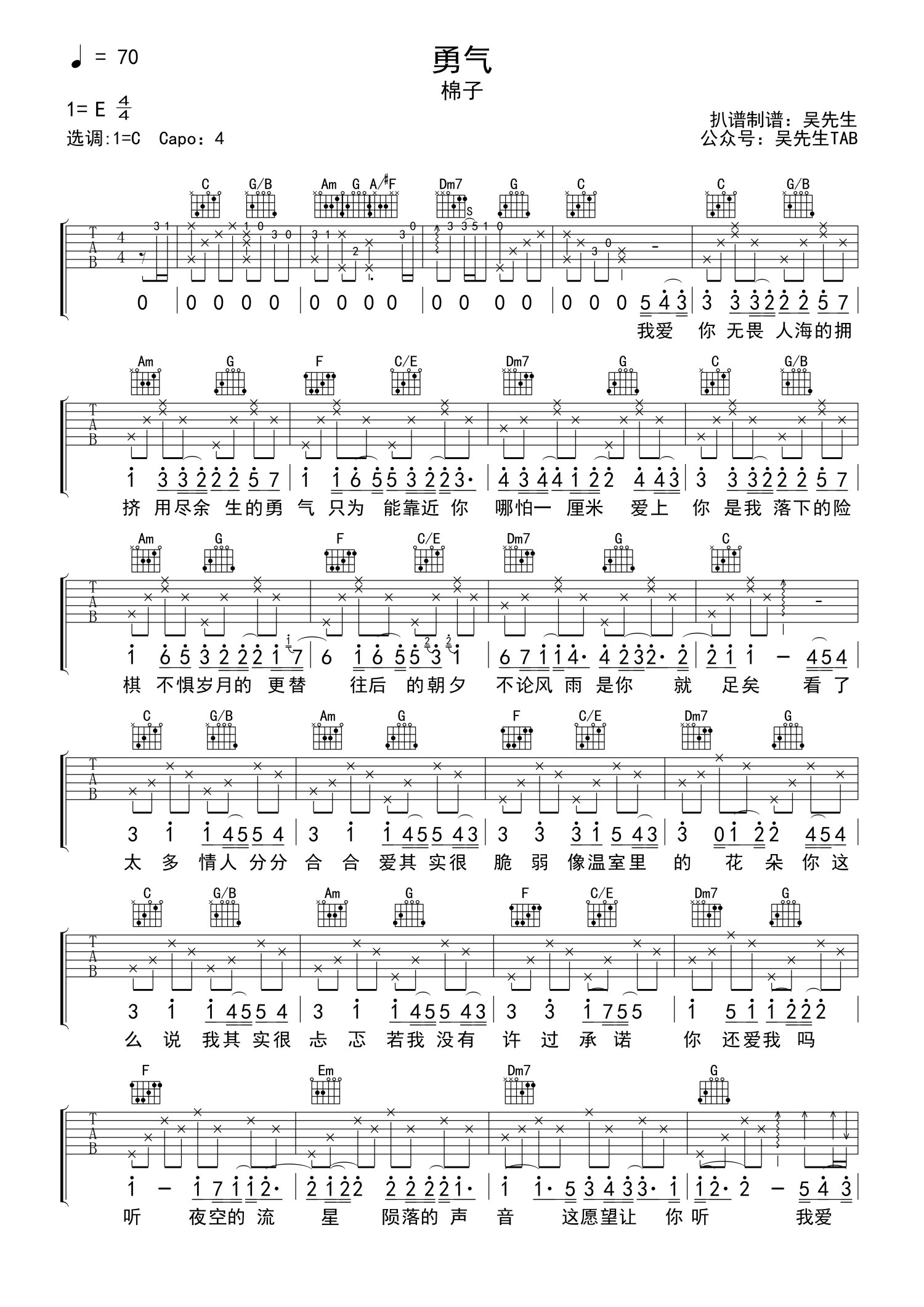 曲谱介绍: 原调E选调C,Capo夹一品。爱一个人,就好像突然有了软肋,也突然有了铠甲。大概就是心每时每刻都被她占据,但却浑然不自知的感觉吧。这首棉子带来的《勇气》一经抖音的播出,就迅速爆火。爱一个人完全是情不自禁的,也许是一见钟情的,也许是慢慢萌发的,不管你愿不愿意承认,就那么不由自主的爱上了。可是,见到他会脸红,说话会语无伦次,心里小鹿乱撞,他推翻了你所有以往的形象,那么你还会鼓起勇气大胆追求自己的幸福吗?遇见就像亿万颗流星中恰巧遇到的那一颗,早一点晚一点都不是那一个。所以,遇到一个喜欢的人,一定不要错过,即使你不知道会有怎样的结局,人海茫茫他都是最特别的那一个。“爱上你是我落下的险棋不惧岁月的更替往后的朝夕不论风雨是你就足矣”不惧岁月的更替,不惧风雨的冷暖,只要是你就好。那么……你呢?有勇气下这种赌注吗?--