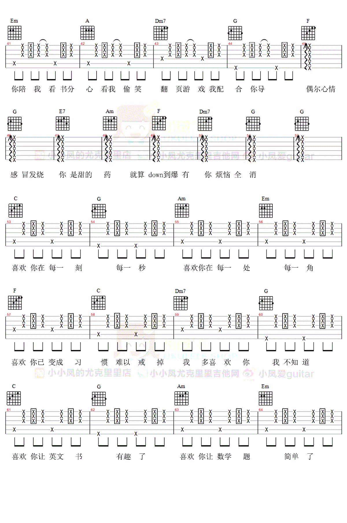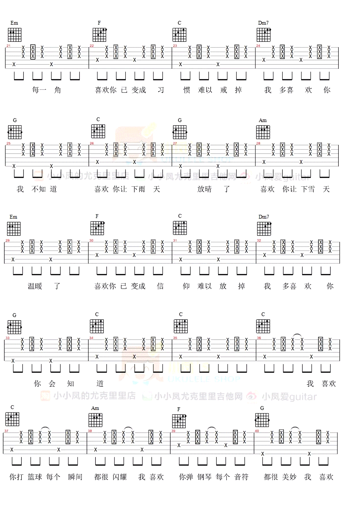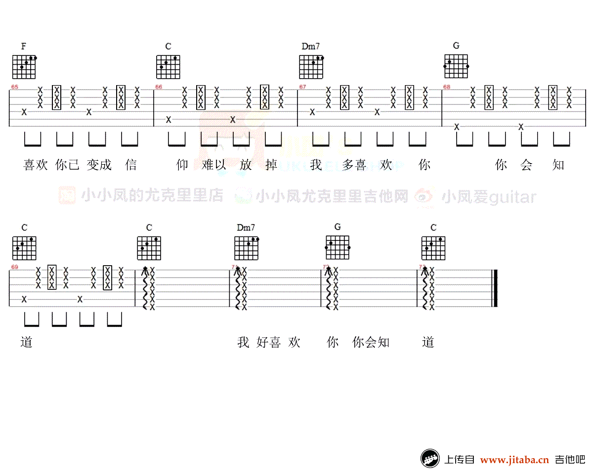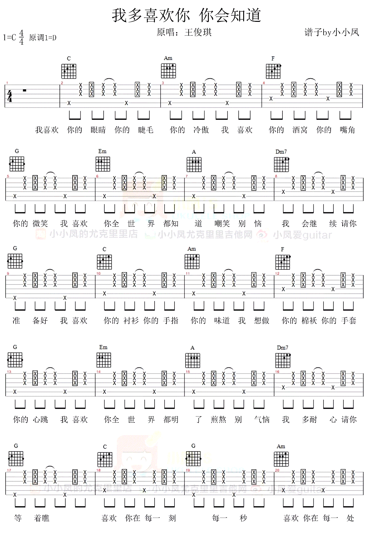 曲谱介绍: 《我多喜欢你,你会知道》吉他谱,王俊琪演唱,网络剧《致我们单纯的小美好》推广主题曲, 我多喜欢你,你会知道吉他弹唱谱,歌曲原调D,选用C调指法,变调夹夹第二品,六线谱完整版共四张图片谱例,感谢小小凤编配,随谱附上吉他弹唱教学视频,喜欢这首甜蜜浪漫歌曲的琴友们练习起来吧。