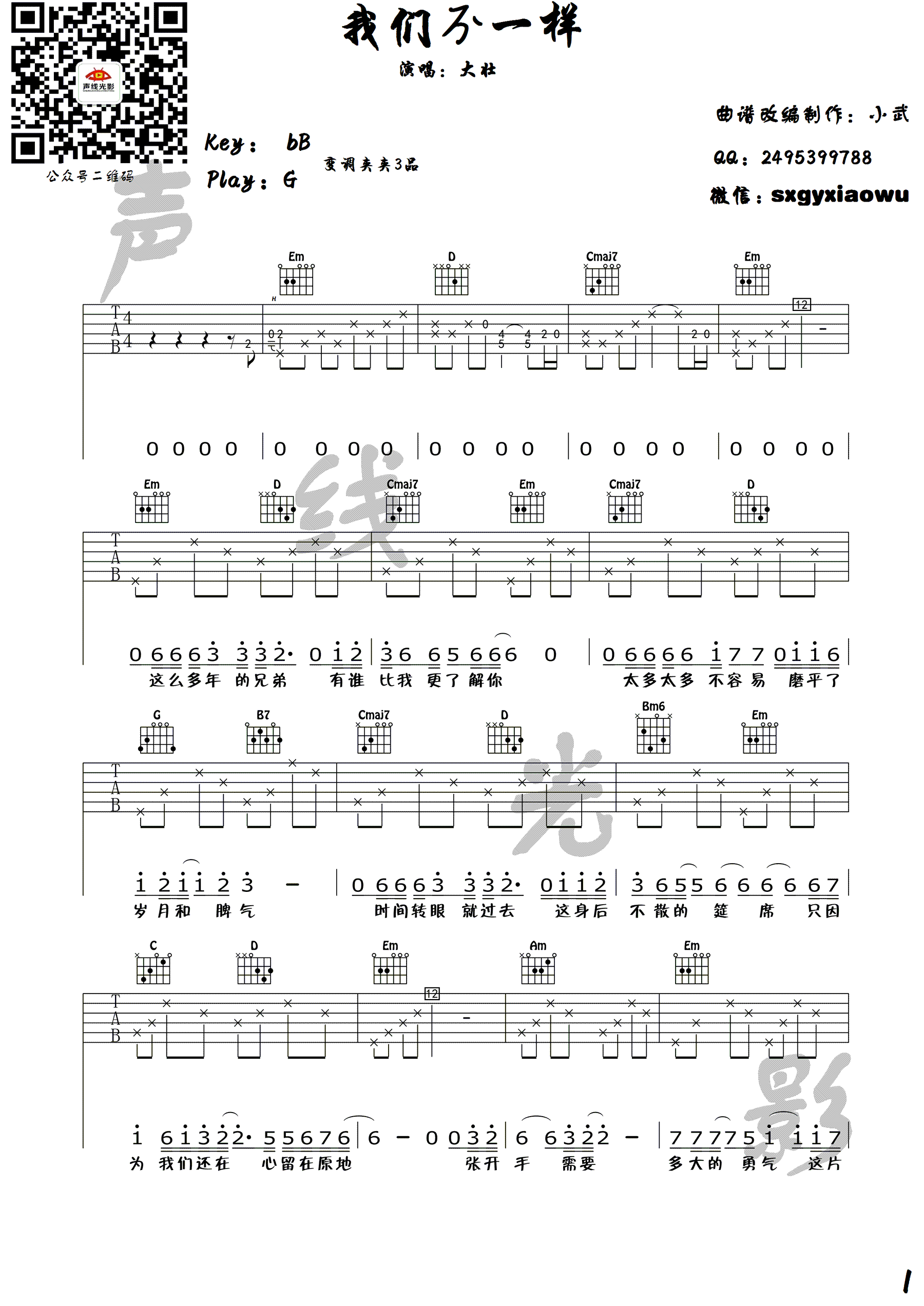 曲谱介绍: 大壮《我们不一样》吉他谱,原调bB,选用G调指法,变调夹夹三品。一首热门网络歌曲,音律高亢、气势磅礴,唱出一个饱经风霜的男人灵魂深处最痛彻心扉的呐喊和拼搏心酸!我们不一样六线谱,高清弹唱图片谱,原曲是电琴做的,本曲谱为抒情版编配,声线光影出品,并提供教学视频,91吉他谱网站上传收藏。
