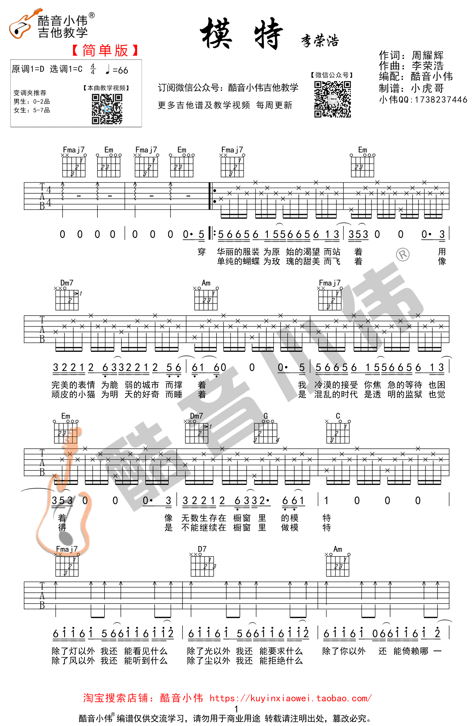 曲谱介绍: 模特吉他谱,李荣浩演唱,本曲谱为C调简单版,歌曲原调D,男生变调夹0-2品,女生推荐5-7品。模特六线谱,高清弹唱图片谱,感谢酷音小伟编配分享,91吉他谱网站上传推荐。