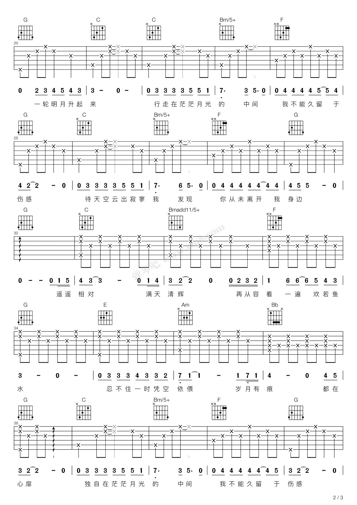 曲谱介绍: 行走在茫茫月光的中间吉他谱,谭维维演唱,电视剧《那年花开月正圆》片尾主题曲,行走在茫茫月光的中间六线谱,变调夹夹三品,高清图片谱,感谢弹琴吧出品,91吉他谱www.jitaba.cn推荐收藏。 我的今生犹如线,几番缠缠绵绵织成棉,极尽缠绵的旋律和歌词,唱出太多感伤和无奈,饱含深情的歌声中展现了一幅意境优美的的月下相思图。