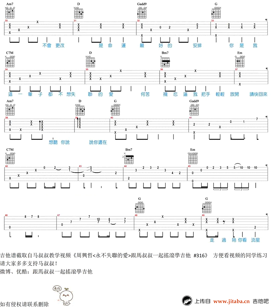 曲谱介绍: 永不失联的爱吉他谱,周兴哲演唱的一首深情动听的歌曲,永不失联的爱六线谱,变调夹夹三品,本曲谱为马叔叔吉他教学出品,91吉他谱推荐收藏。随谱附上《永不失联的爱》吉他弹唱教学视频,琴友们参照马叔叔的j讲解练习。我相信,走进心灵深处的爱,是不会轻易放弃的,这也是一辈子不能释怀的爱,就让这种爱延伸吧,直到生命的彼岸! ​