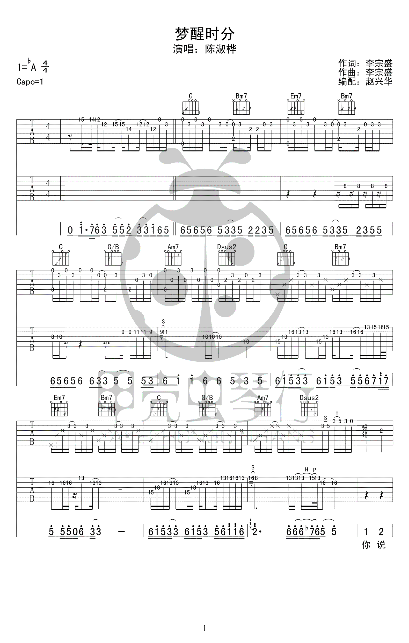 曲谱介绍: 梦醒时分吉他谱,双吉他版本,原调bA,capo夹一品,李宗盛词曲,陈淑桦演唱的一首国语流行歌曲经典。梦醒时分六线谱,完整版四张高清图片弹唱谱,感谢赵兴华编配,91吉他谱网站上传。
