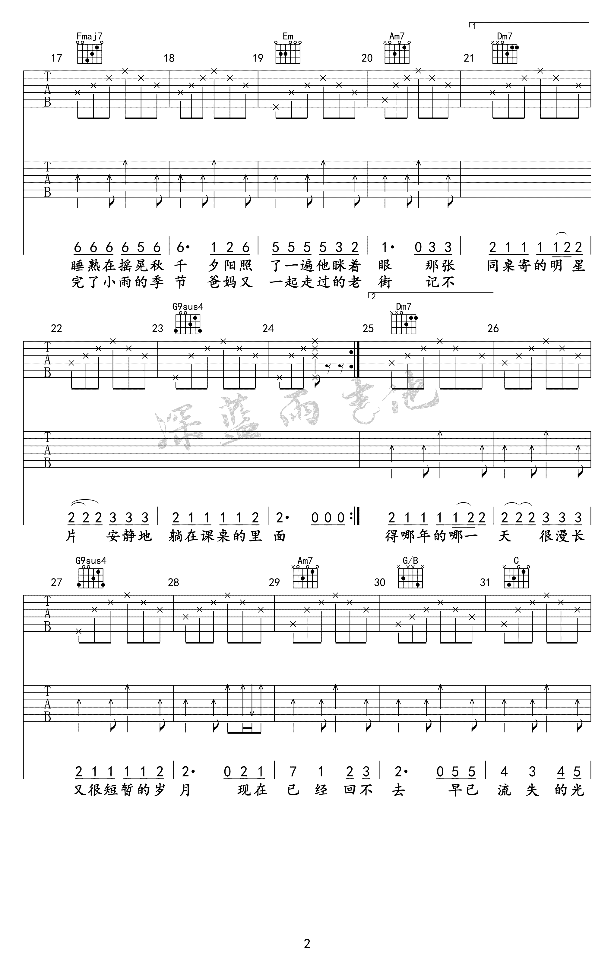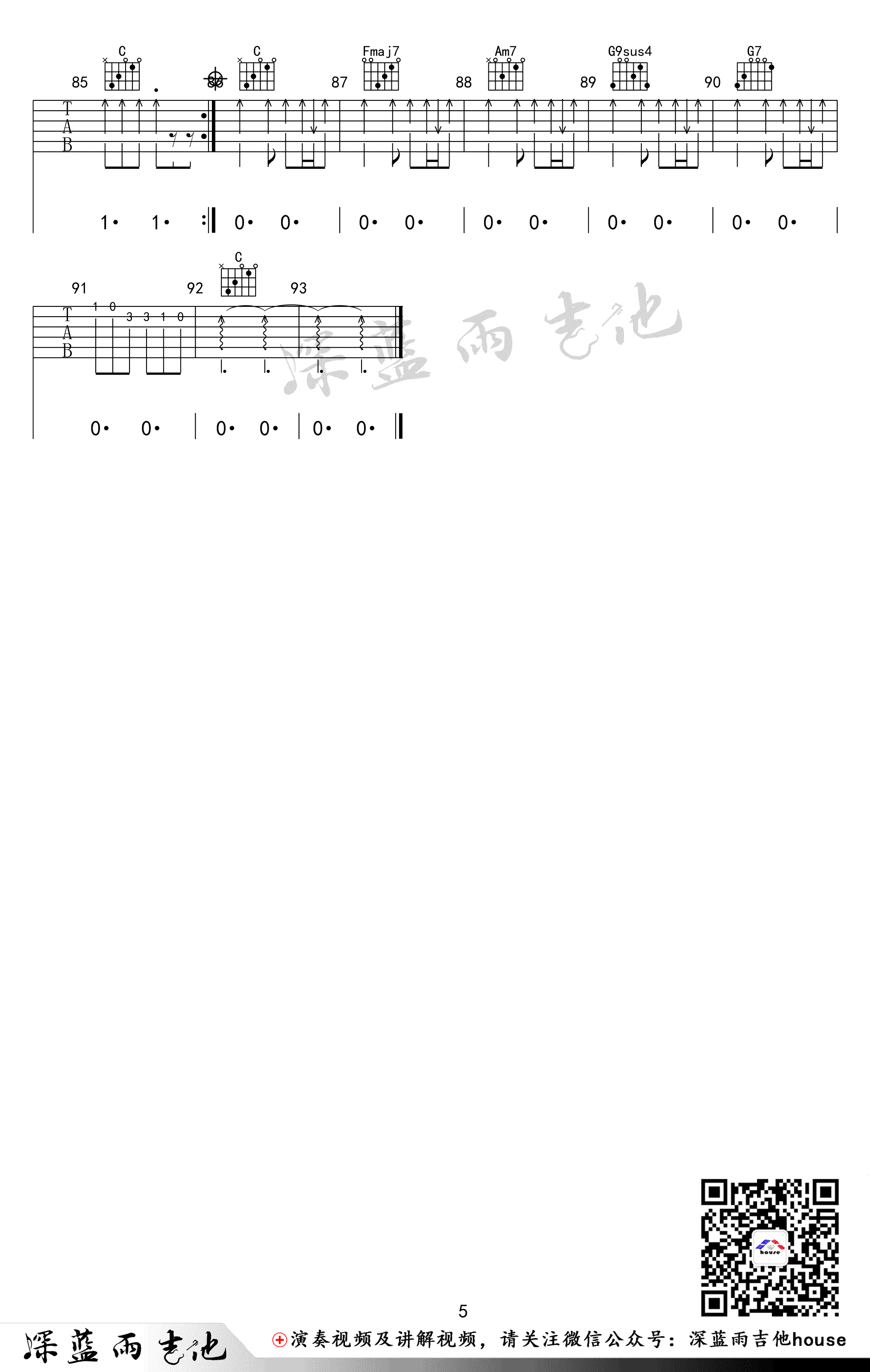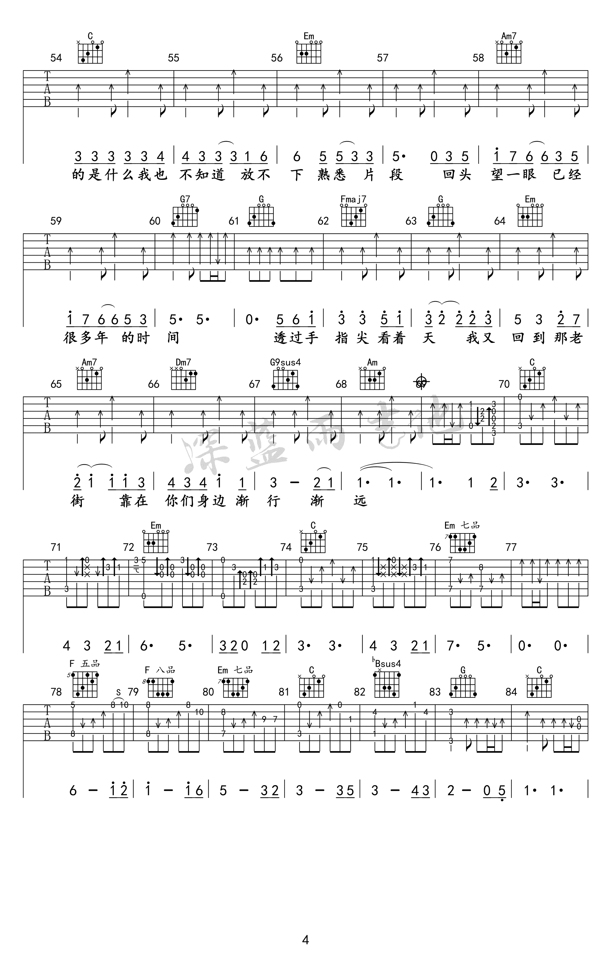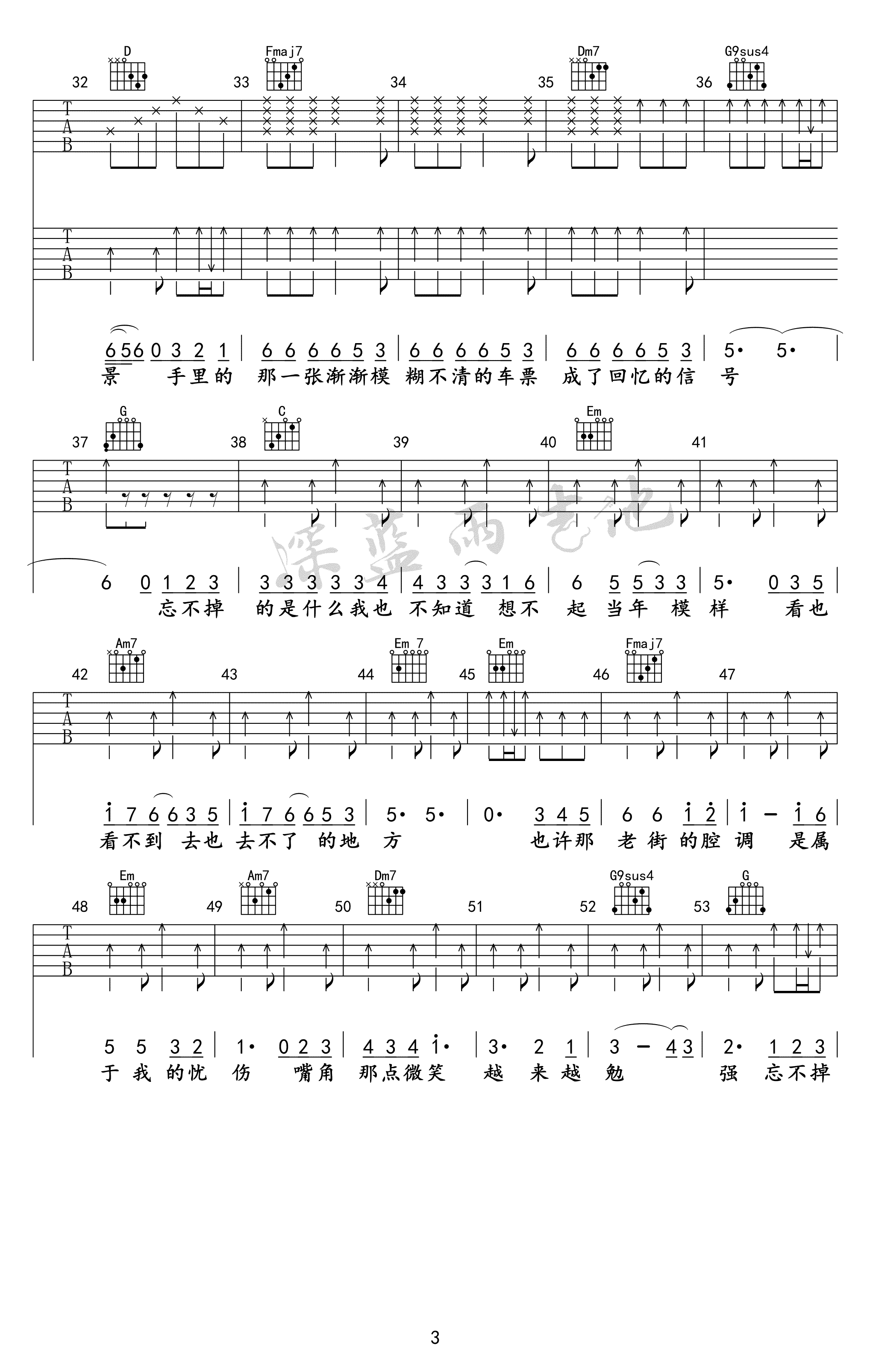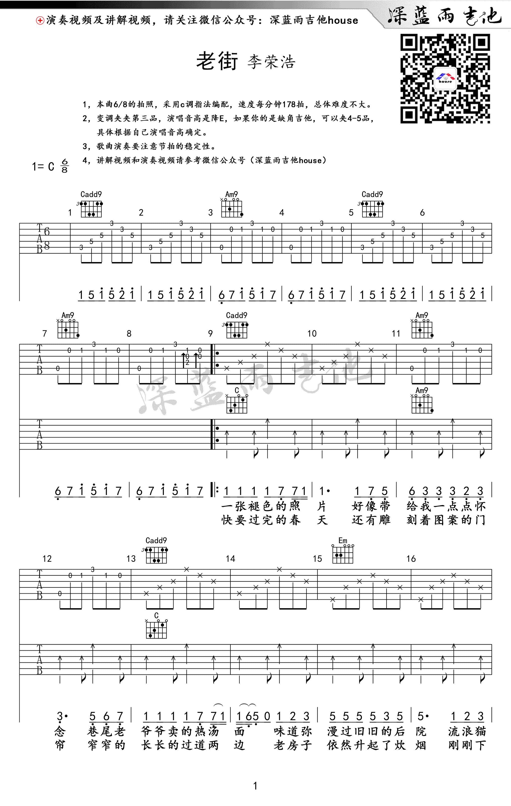 曲谱介绍: 李荣浩《老街》吉他谱,高清图片谱,完整版共五张六线谱例。老街吉他弹唱谱,歌曲是6/8拍子。采用C调指法编配。速度每分钟178拍,总体难度不大。变调夹夹第三品。演唱音高是降E调,如果你的是缺角吉他,可以夹四到五品,具体根据自己演唱音高确定。歌曲演奏要注意节拍的稳定性。讲解视频和演奏视频请参考下方,感谢深蓝雨吉他出品,91吉他谱网站为琴友们整理上传。 《老街》吉他弹唱视频演示: 《老街》吉他教学视频教学:
