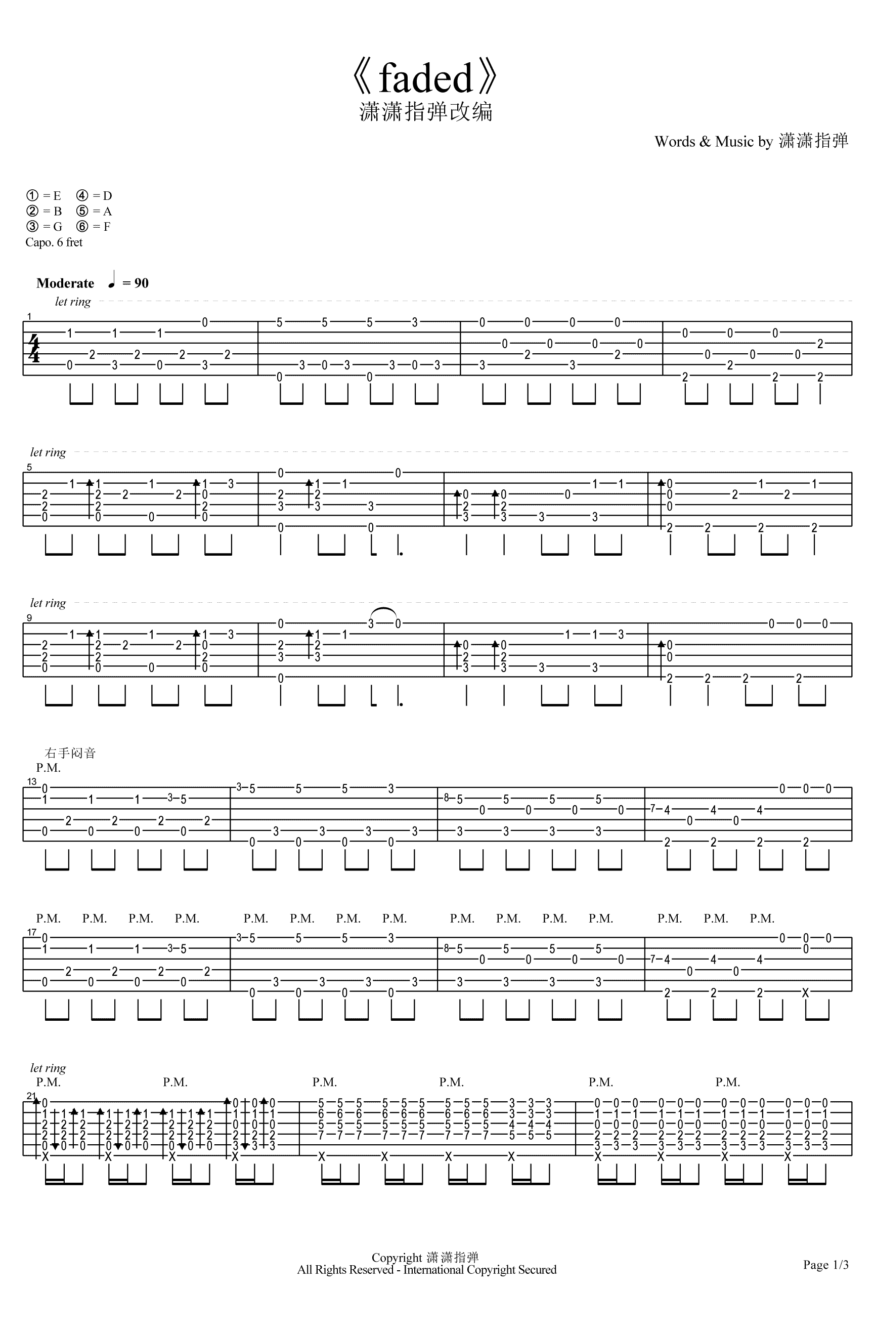 曲谱介绍: faded指弹吉他谱,潇潇指弹改编版本,alan walker的热门电音《faded》吉他独奏谱,CAPO夹六品,三张图片谱例,为方便琴友们学习,同时附上《faded》GTP谱文件,感谢潇潇老师编配分享,大家参照视频演示弹奏练习起来吧。
