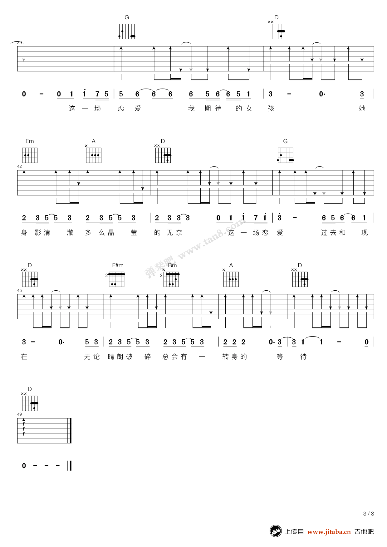 曲谱介绍: 一场恋爱吉他谱,热播电视剧《猎场》主题曲,杨宗纬深情演唱,一场恋爱六线谱,高清图片谱。弹吧编配出品,91吉他谱网站推荐收藏。杨宗纬磁性嗓音娓娓讲述着郑秋冬和罗伊人青涩的,慌乱的,坚定的恋爱。每次放这首歌的时候都很应景,这一场恋爱,我期待的女孩,她身影清澈多么晶莹的无奈!