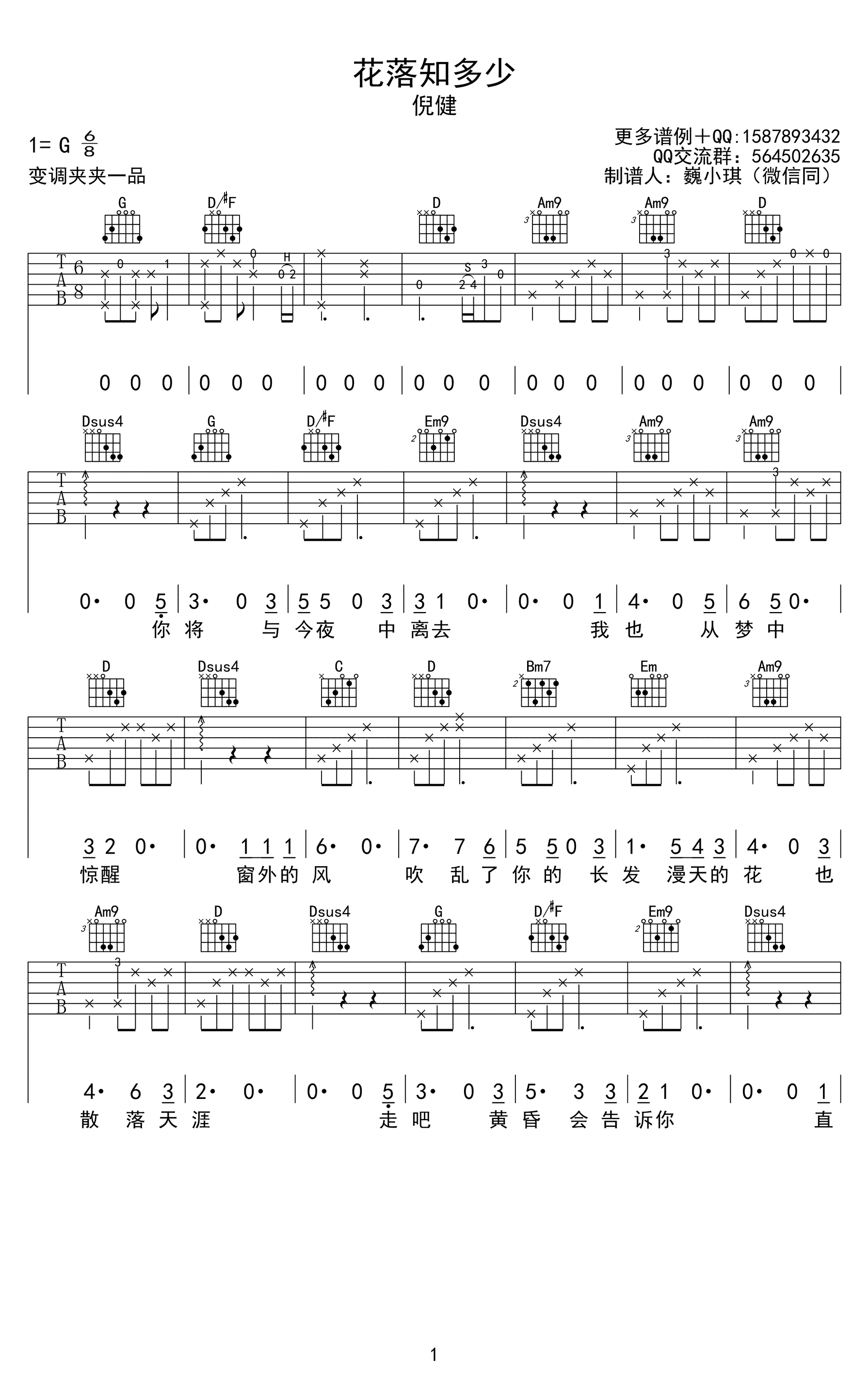 曲谱介绍: 花落知多少吉他谱,倪健演唱,花落知多少六线谱,G调指法,变调夹夹一品,曲谱为高清弹唱谱,三张图片谱例,感谢巍小琪制谱,91吉他谱上传推荐。 昨夜不知身是客,梦里花落知多少,一首温暖而不矫情的民谣歌曲,很多人说倪健的歌像诗,细细品尝,方得其中滋味。