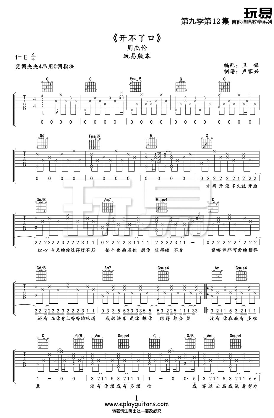 曲谱介绍: 周杰伦《开不了口》吉他谱,原调E,变调夹夹四品用C调指法,开不了口吉他弹唱六线谱,这首歌的难度不是很大,主要就在一些大横按、扫弦,连音和连勾技巧。琴友们可以通过吉他教学视频的讲解示范,来学习到这些非常实用的技巧使用。这里感谢卫峰老师的编配和卢家兴辛苦制谱。
