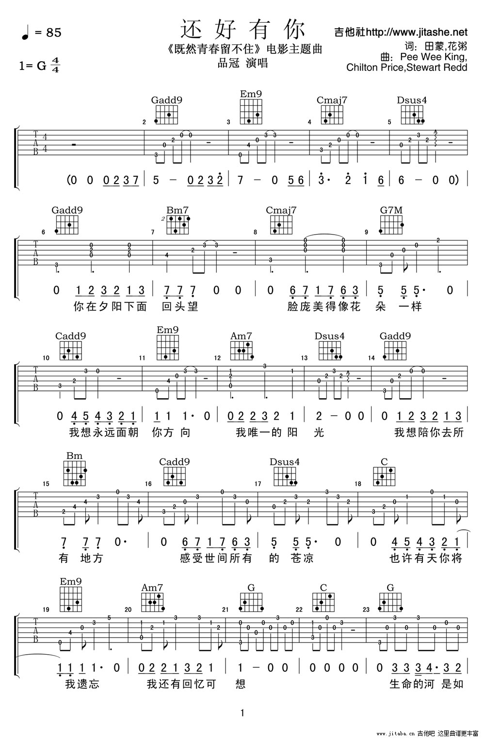 曲谱介绍: 品冠还好有你吉他谱,电影《既然青春留不住》主题曲,还好有你六线谱,G调编配高清图片谱。品冠温暖的声音有抚慰人心的作用,纯净透彻的声线,安静治愈,会让你觉得这个世界非常美好。