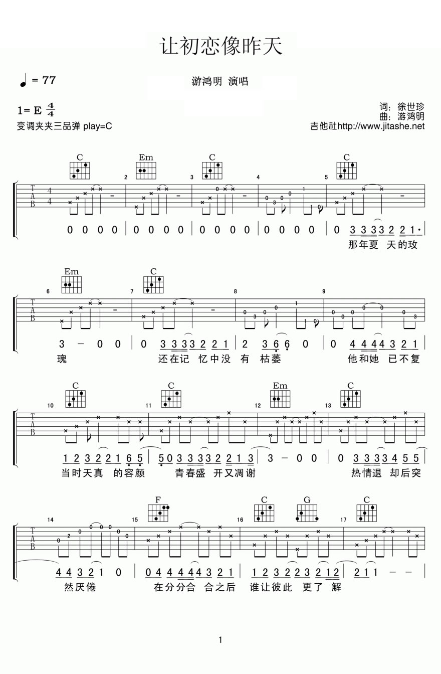 曲谱介绍: 游鸿明让初恋像昨天吉他谱,原调E,变调夹夹三品,选用C调指法,让初恋像昨天吉他谱,六线谱编配三张图片高清版。昨天已回不去,过去的都过去了,无论多爱过,多伤过,时间让它淡得让你忘了它之前的存在。歌声仿佛带我们穿越时光的走廊,回归到最初的点点滴滴的情感记忆,感受最单纯的酸甜。