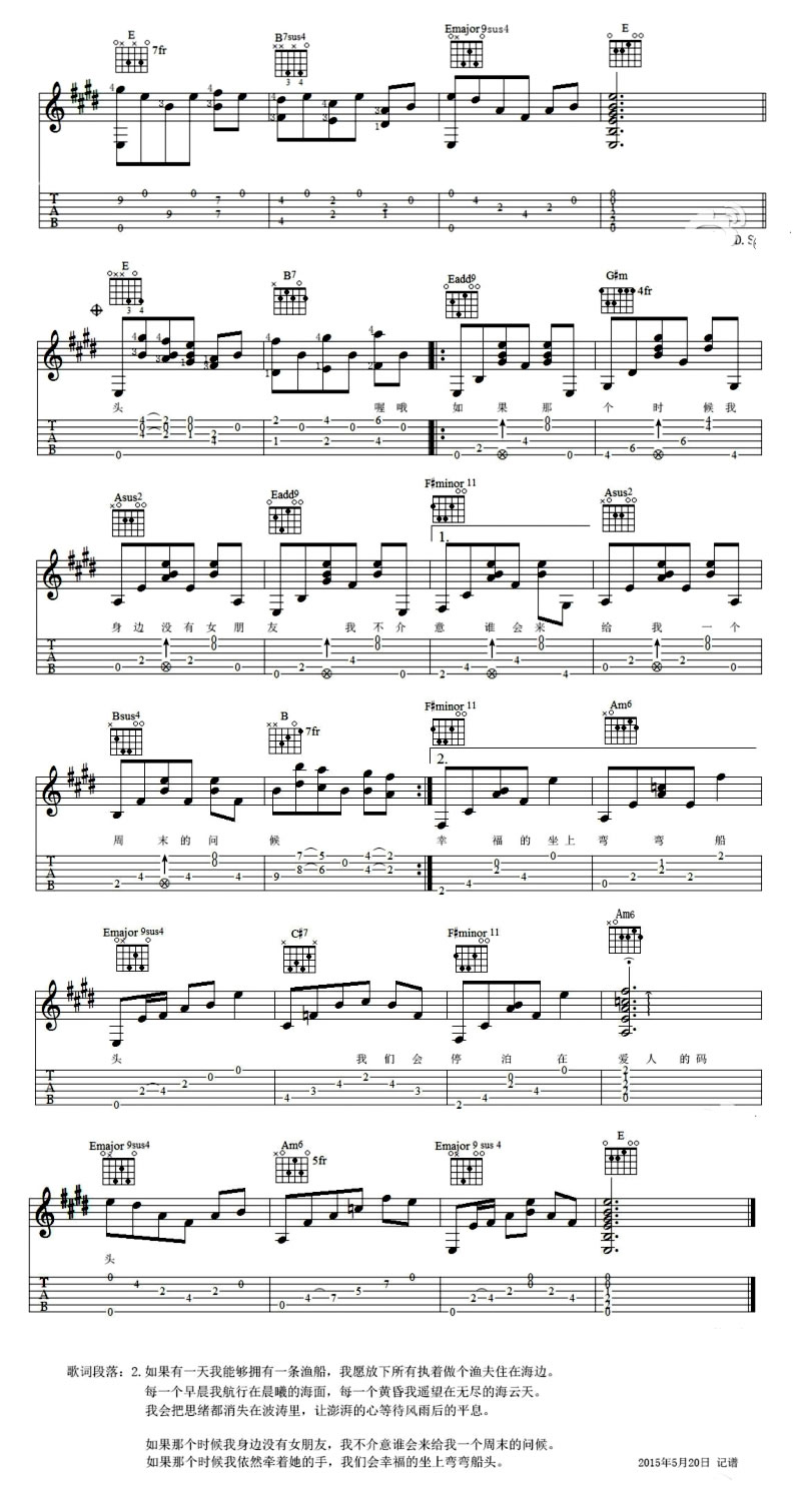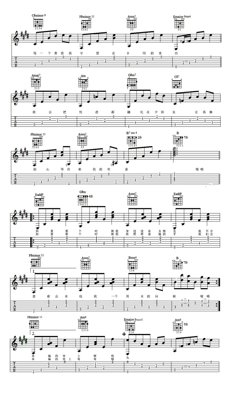 曲谱介绍: 农夫渔夫吉他谱,小猛词曲原唱,图片谱完整版。大乔小乔的这首《农夫渔夫》原创来自于一个热爱民谣的吉他手及编曲录音艺人小猛。每一个早晨我耕耘在绿野田园,每一个黄昏我守望在乡间的麦田。”是多少生活在大城市里的人们所向往的生活?大乔小乔的《农夫渔夫》唱出了普通百姓单纯安逸的生活。那里的简单纯粹可以抚平我们躁动的心,安慰我们受伤的心。