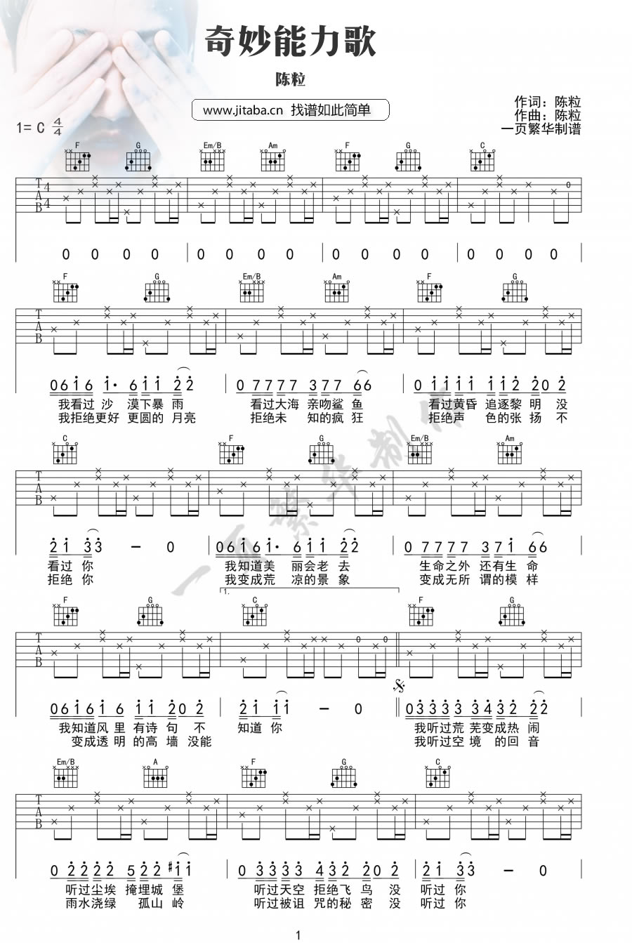 曲谱介绍: 奇妙能力歌吉他谱C调简单版,陈粒歌曲六线谱,三张图片谱。独立音乐创作歌手陈粒的这首奇妙能力歌,动听简单的旋律,细腻的歌词,安静的时候吉他弹唱,别有一番意味。91吉他谱网站为你推荐。