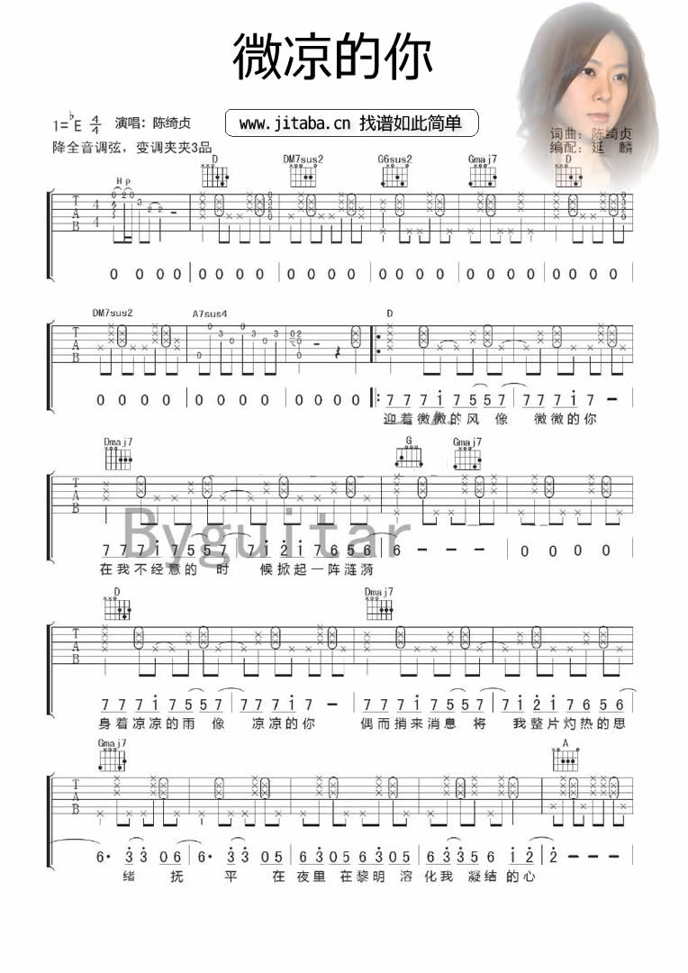 曲谱介绍: 陈绮贞的一首早期创作的民谣歌曲,微凉的你吉他谱。曲谱原调是降E调,需要降全音调弦,Capo3品。微凉的你吉他弹唱,歌曲旋律舒展、节奏轻松,散发着清新自然的气息。